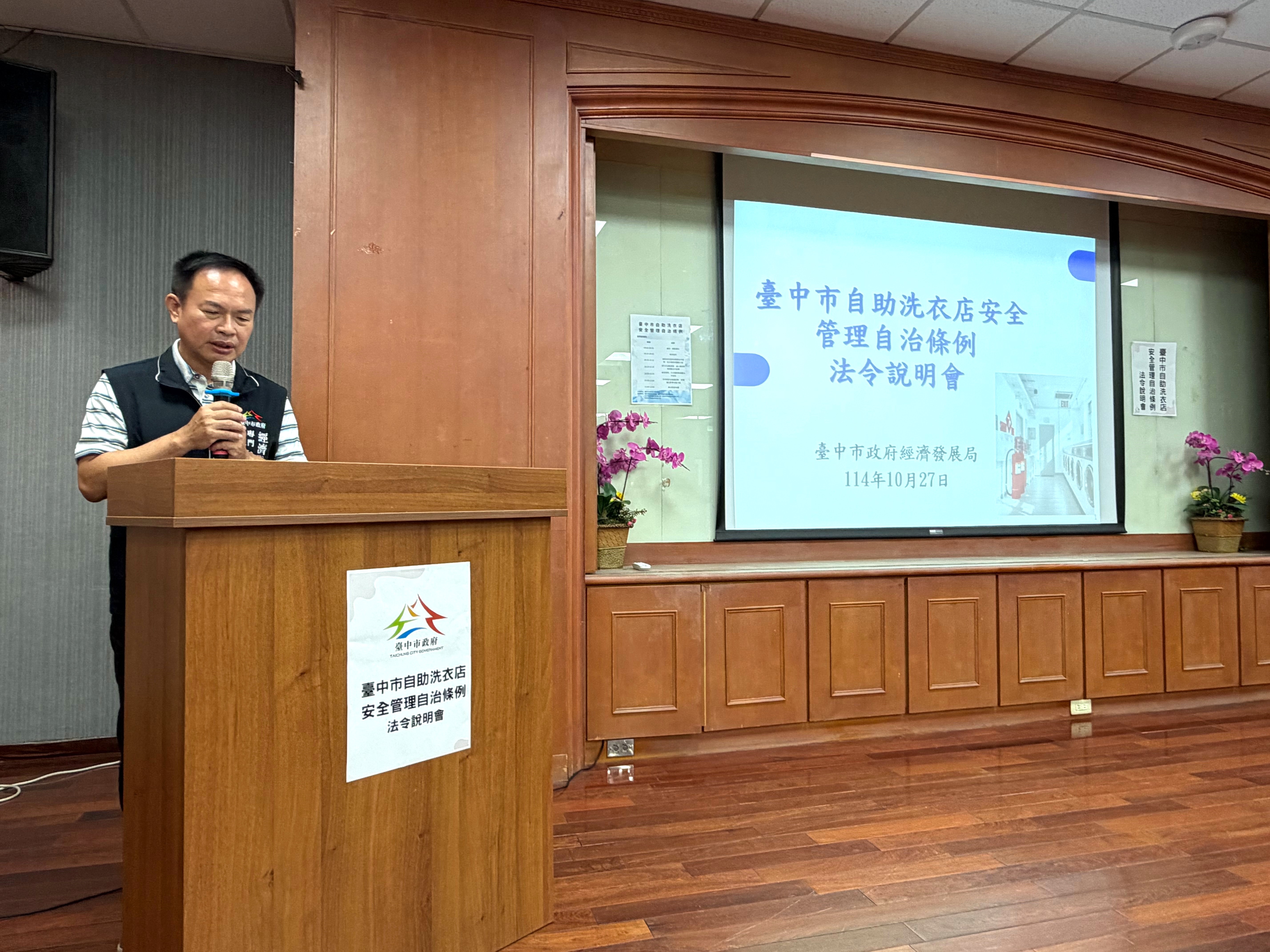 為強化自助洗衣業安全管理及提升公共安全意識,協助業者瞭解並遵循相關法令規範,台中市政府經濟發展局今(27)日舉辦首場「自助洗衣店安全管理法令說明會」,並結合環保局及消防局共同宣導,活動現場不少既有業者參加,展現對安全營運與市府政策推動的高度重視,落實市府「整合宣導、共創安全城市、永續經營」的施政目標。