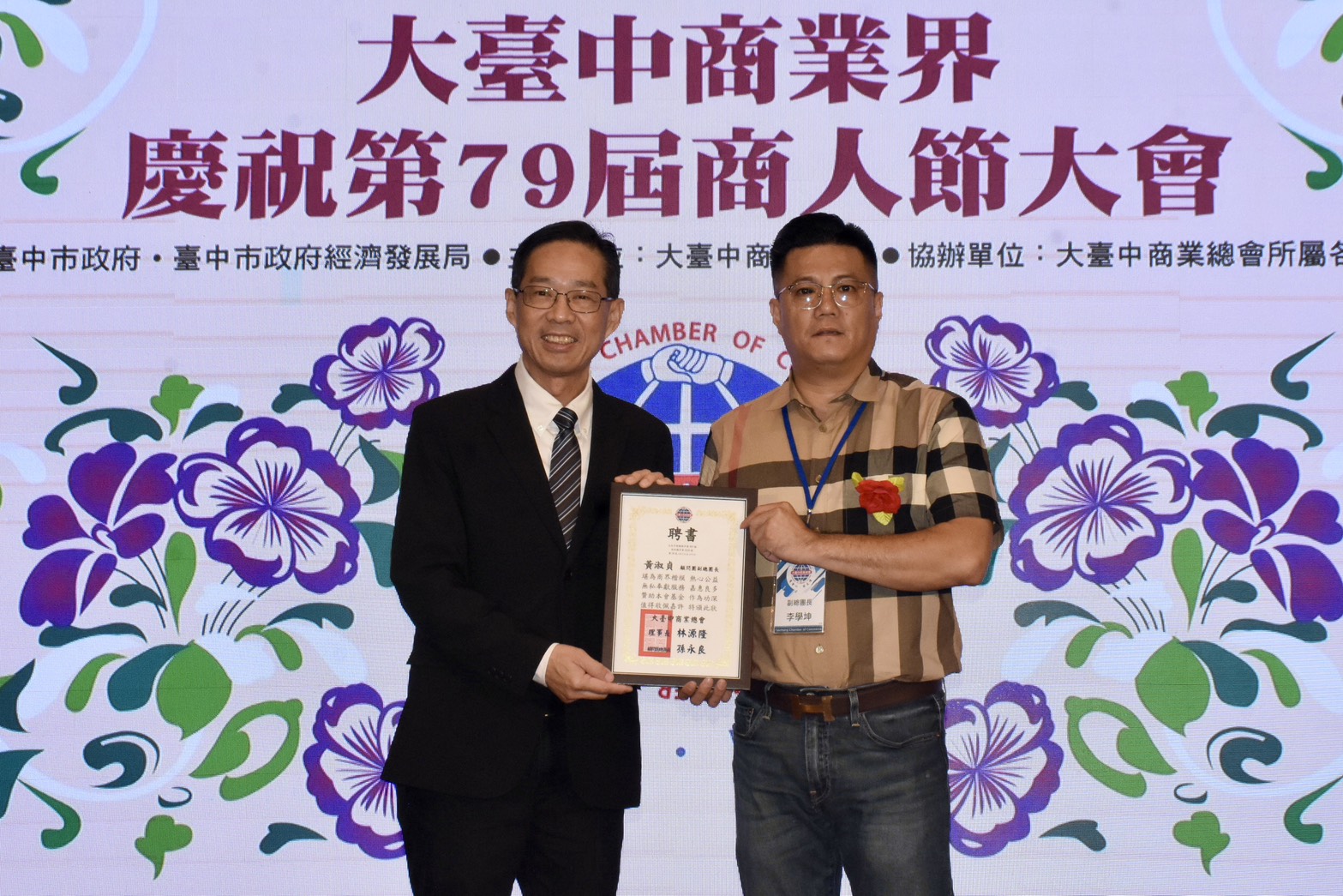 大台中商業會今(30)日盛大舉辦第79屆商人節表揚大會活動,由經發局長張峯源代表市長盧秀燕頒發優良商戶、商號及績優公會理事長等獎項,特別感謝商業界多年來為台中經濟活動的付出,協助政府對內推動經濟建設,對外開拓貿易市場,並肯定公會作為商業楷模與業界標竿。