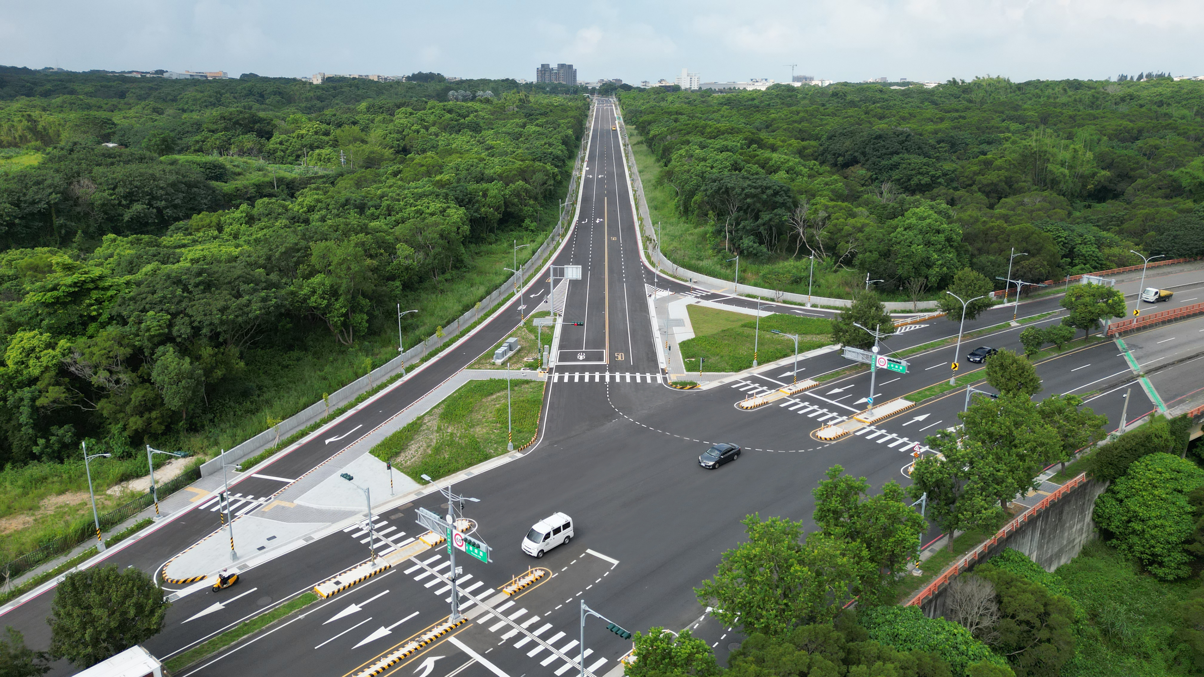 建設局說明,本案開闢計畫分為2期執行,全長約1,864公尺,寬度20公尺,並於道路兩側設有3公尺寬實體人行道,其中留設1公尺寬設施植栽帶,保留現地大肚山原生樹種,如小梗黃肉楠、山香圓及小葉赤楠等,並針對生長狀況不佳的喬木,則會破碎製成木屑,用於植栽沃土與有機肥料,落實永續環保理念。