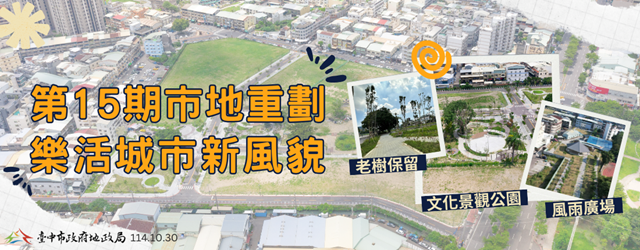 市地重劃不僅提高土地利用價值,促進區域建設發展,更可有效取得公共設施用地,建設宜居生活環境;台中市府地政局近年辦理第13期大慶公辦市地重劃區、第14期美和庄公辦市地重劃區及第15期大里杙公辦市地重劃區,為台中市建立都市新風貌並健全公共設施,在開發過程中更竭力保留在地自然生態及歷史文化,提供民眾優質舒適的生活空間,並創造藍綠帶交織的都市環境。