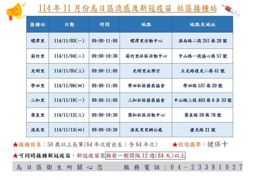 114年11月份烏日區流感及新冠疫苗社區接種站日程表。