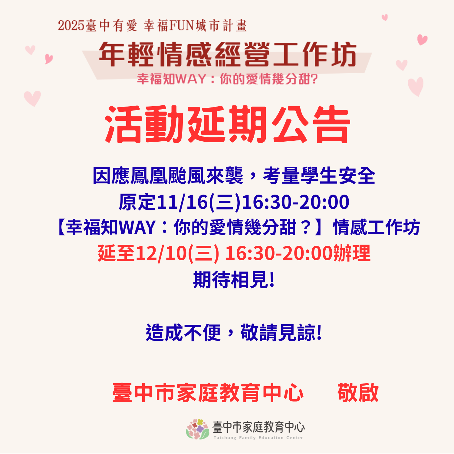 📢【活動延期公告】 因應鳳凰颱風來襲🌧️ 為了維護同學們的安全, 原訂 11/16(六)16:30–20:00 辦理之 💕《幸福知WAY:你的愛情幾分甜?》情感工作坊 將延期至 12/1...