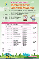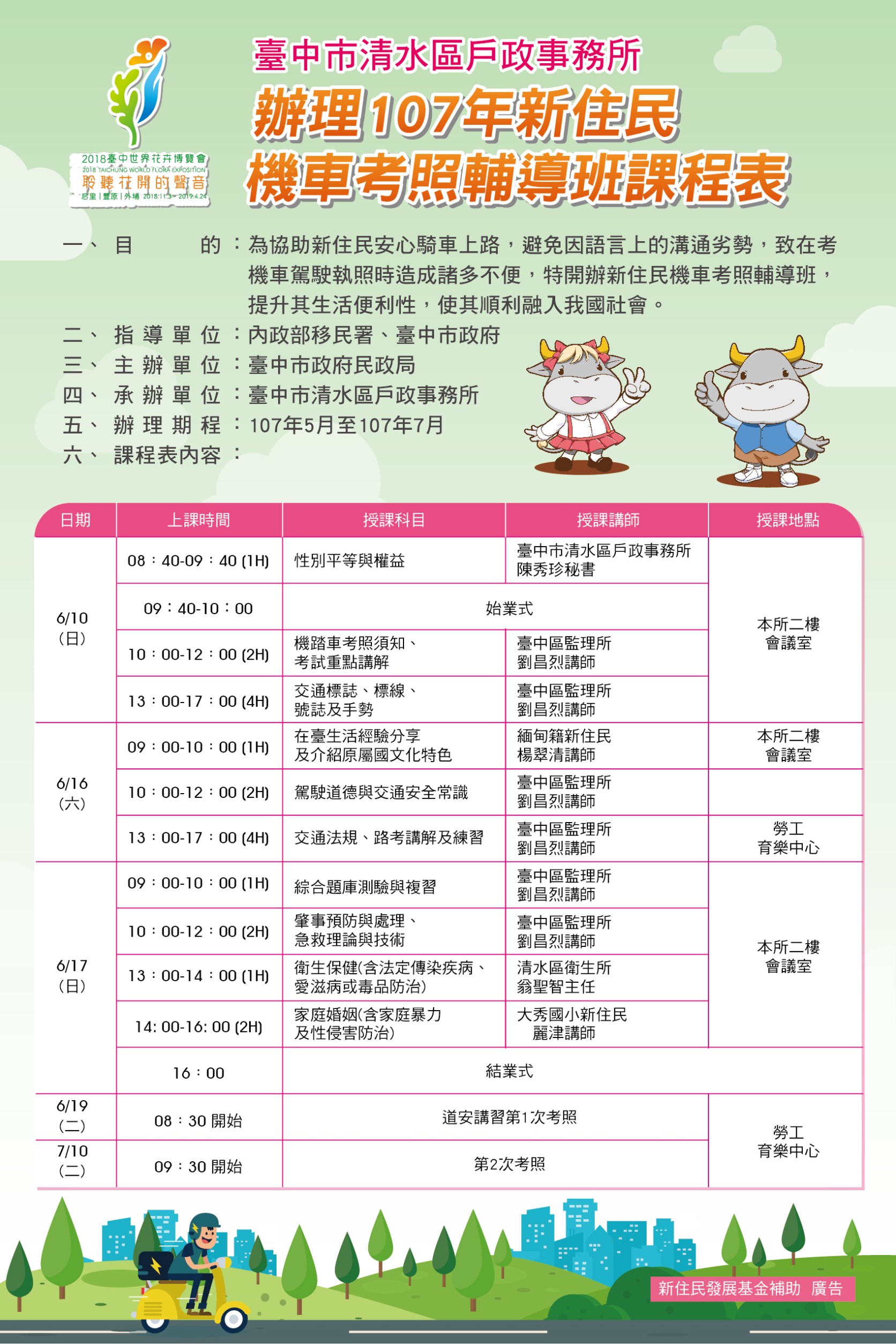 一、目的:為協助新住民安心騎車上路,避免因語言上的溝通劣勢,致在考機車駕駛執照時造成諸多不便,特開辦新住民機車考照輔導班,提升其生活便利性,使其順利融入我國社會。二、指導單位:內政部移民署、臺中市政府三、主辦單位:臺中市政府民政局四、承辦單位:臺中市清水區戶政事務所五、辦理期程:107年6月10.16.17日六、辦理地點:臺中市清水區戶政事務所(臺中市清水區鰲峰路239號)