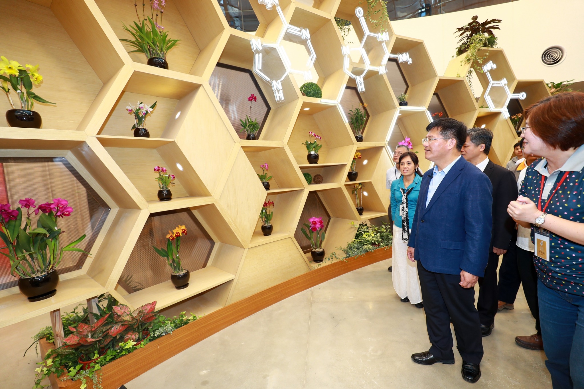 「蘭領風騷-百大名人堂」以代表生命起源的細胞鏈結六角形櫥窗,置放各育種者精心培育的蘭花;遊客可藉由QR code連結了解該株蘭花的育種者及品種特性等資訊。「蘭海盛宴」以蘭花知識雲為設計概念,以大數據網路的科幻型態漂浮;遊客點選3個最感興趣的關鍵字後,即可對應出一種專屬的蘭花。