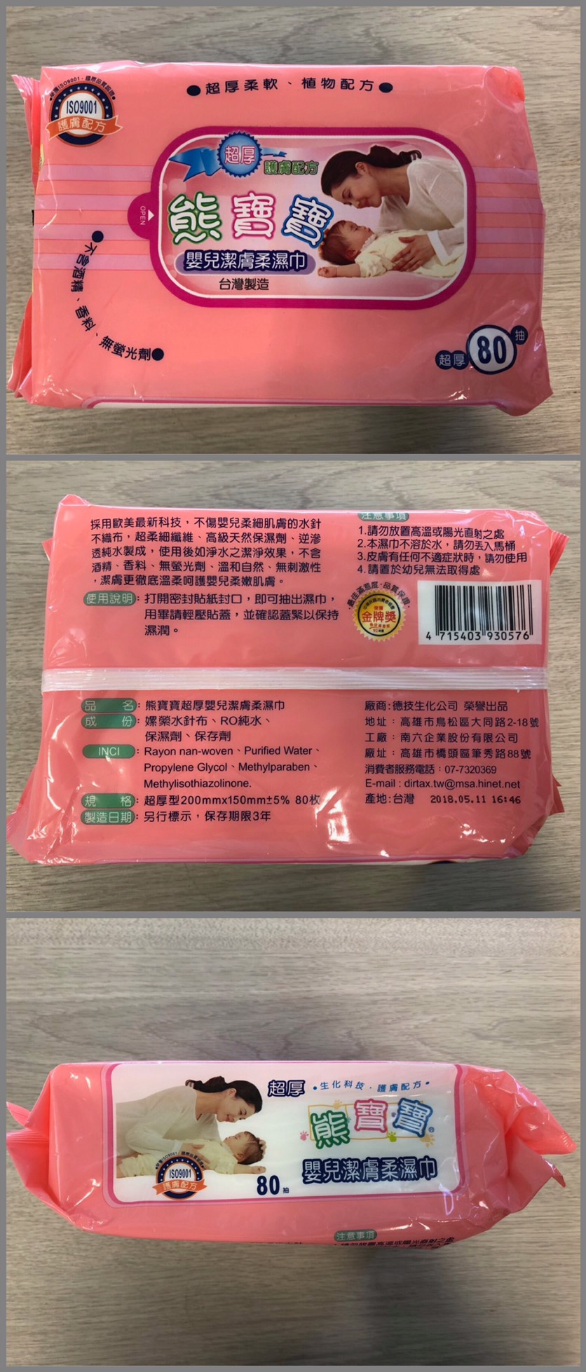 主任消保官康馨壬進一步說明,這些違規情形已全數改正,其中,設址於高雄市的德技生化有限公司委製「熊寶寶嬰兒潔膚柔濕巾」,經衛生福利部複檢查獲違規添加只限使用於立即沖洗掉產品的Methylisothiazolinone防腐劑,此部分當地衛生局依法限期業者下架回收,各地方衛生局也通知所轄通路下架。