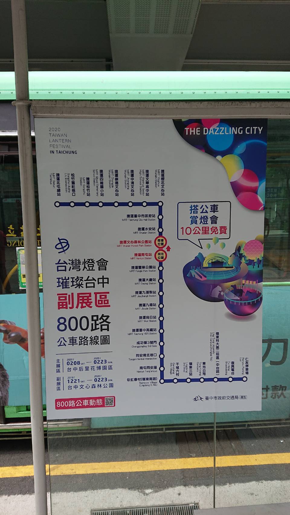 2020台灣燈會副展區將於(21)日起在文心森林公園璀璨登場,因停車空間有限,交通局呼籲民眾多利用周遭10條公車路線前往賞燈,其中800路公車較其他路線快捷,主要行經文心路、北屯路及松竹路,尖峰班距約10到20分鐘、離峰及假日約15到30分鐘,並將視人潮機動加開「高鐵台中站-文心森林公園」區間車;搭乘台鐵民眾可於大慶車站轉乘抵達;搭乘高鐵民眾則可於台中站轉乘前往,快速經濟又方便。