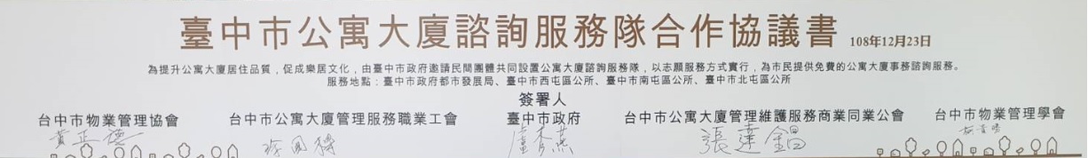 名稱 臺中市公寓大廈諮詢服務隊合作協議書 主辦機關 臺中市政府市都市發展局 簽署對象 台中市公寓大廈管理維護服務商業同業公會、台中市公寓大廈管理服務職業工會、台中市物業管理學會、台中市物業管理協會 簽訂日期 108年12月23日(自113年1月1日本協議延長2年辦理) 聯絡人 紀小姐 聯絡電話 (04)2228-9111 分機 69527
