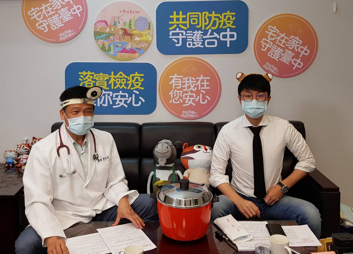 今日直播活動邀請到新聞局長黃國瑋,戴上可愛石虎耳朵髮箍,與曾局長一起示範如何使用電鍋乾熱法消毒口罩。不少民眾現場詢問:「電鍋用完能不能繼續使用?」、「能否用氣炸鍋或電子鍋代替」等問題,甚至還有民眾許願,希望兩局局長唱《兩隻老虎》結束節目,現場歡笑連連、趣味十足。