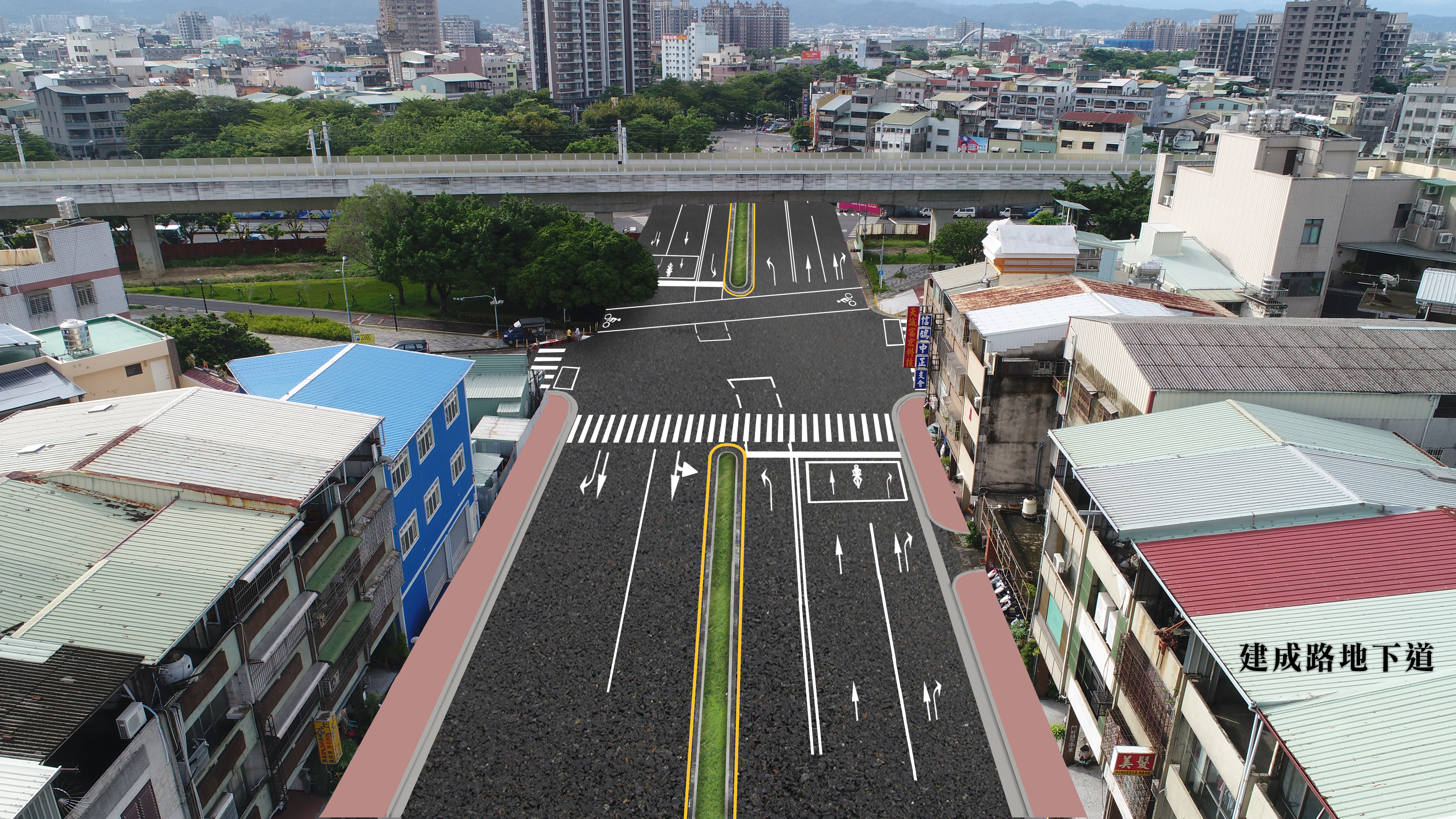 建設局長陳大田表示,台中鐵路高架化後,市府規劃將太原路、圓環北路、建成路、國光路、五權路等5處地下道填平,填平總經費3億1,682萬元(含雨、汙水下水道及寬頻管道工程),感謝營建署補助主體工程7成經費。其中,建成路地下道填平工程總經費約4,040萬元,工程總長306公尺、寬約30公尺,預計施工10個月;為降低交通衝擊,施工團隊秉持「行車無阻礙,施工不封路」原則,一邊填平、一邊維持雙向雙車道通行,施工期間也呼籲民眾多利用周遭精武路、自由路、進化路及進德路等道路通行,分散車流。