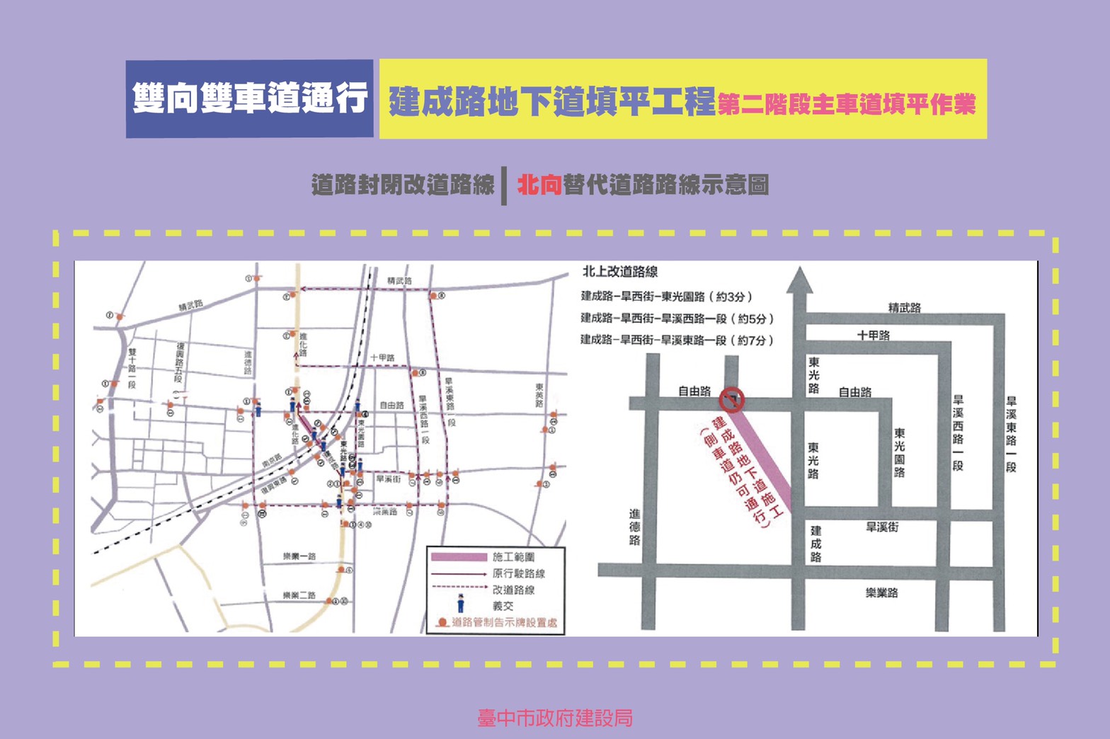 陳局長指出,建成路地下道主線將封閉約6個月,請駕駛朋友改由側車道通行,調整後仍維持「雙向雙車道」供汽、機車通行,也請民眾多利用周遭精武路、自由路、進化路及進德路等替代道路通行。未來地下道填平後,配合汙水管道建置,將可大幅改善台中車站周遭交通路網,提升生活品質。(6/9*7)*建設局