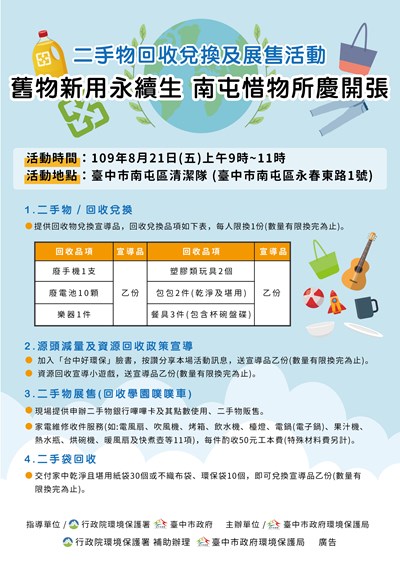 此外,也歡迎民眾申辦「二手物嗶嗶卡」,回收累積點數換購二手物,相關訊息可於環保局資源回收網( https://bit.ly/2z8wnr7 )查詢;或電洽環保局二手物回收專線04-22294025。(8/11*11)*環境保護局
