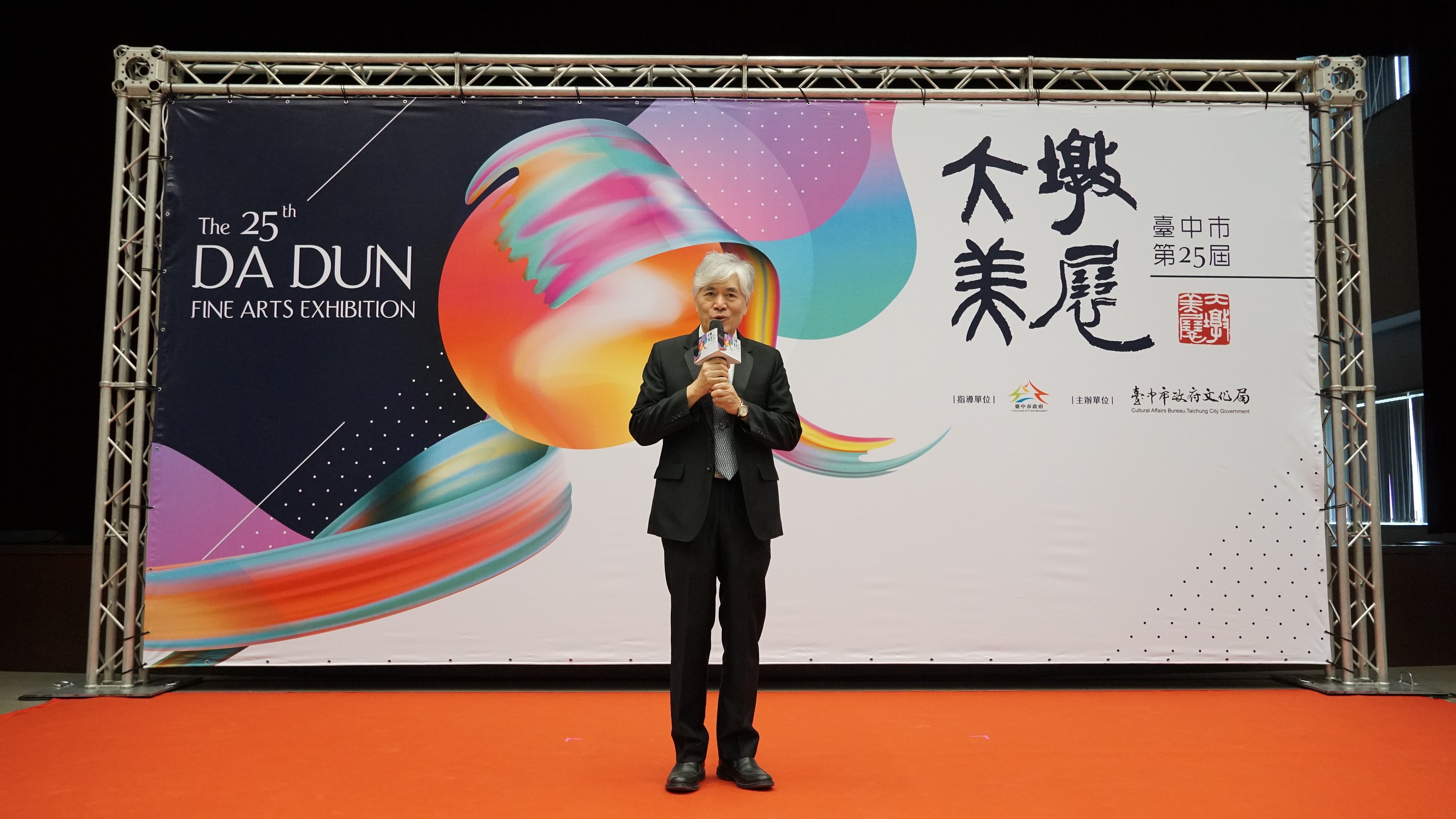 台中市政府文化局今(21)日在台灣大道市政大樓舉辦「台中市大墩美展」記者會,由文化局長張大春、評審委員詹前裕、程代勒及謝省民老師,與得獎者攝影類第一名陳姵如女士、油畫類第一名張國二先生、水彩類第一名余沛倫女士,共同邀請民眾前往觀展。