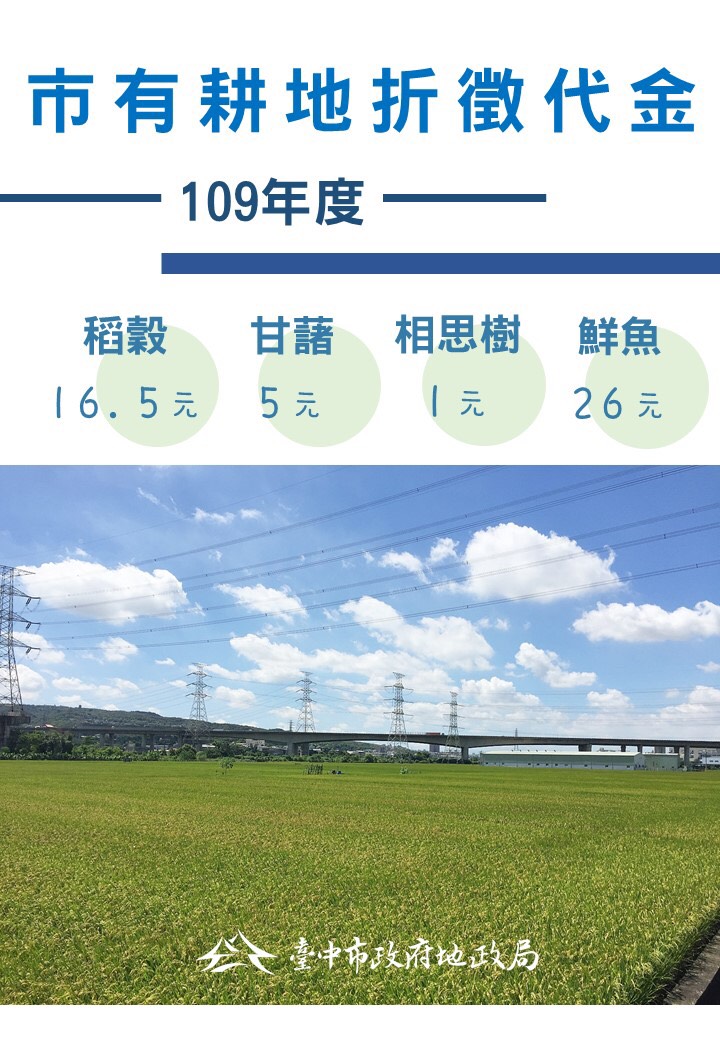 地政局長吳存金表示,台中市政府於去年召開中部4縣市出租耕地佃租實物折徵代金標準聯席會議,與彰化、苗栗、南投縣政府共同開會研商議定109年期實物折徵代金標準,經會議決議各實物折徵代金標準,分別為稻穀每公斤16.5元、甘藷每公斤5元、相思樹每公斤1元、鮮魚每公斤26元,並已於去年11月17日公告。