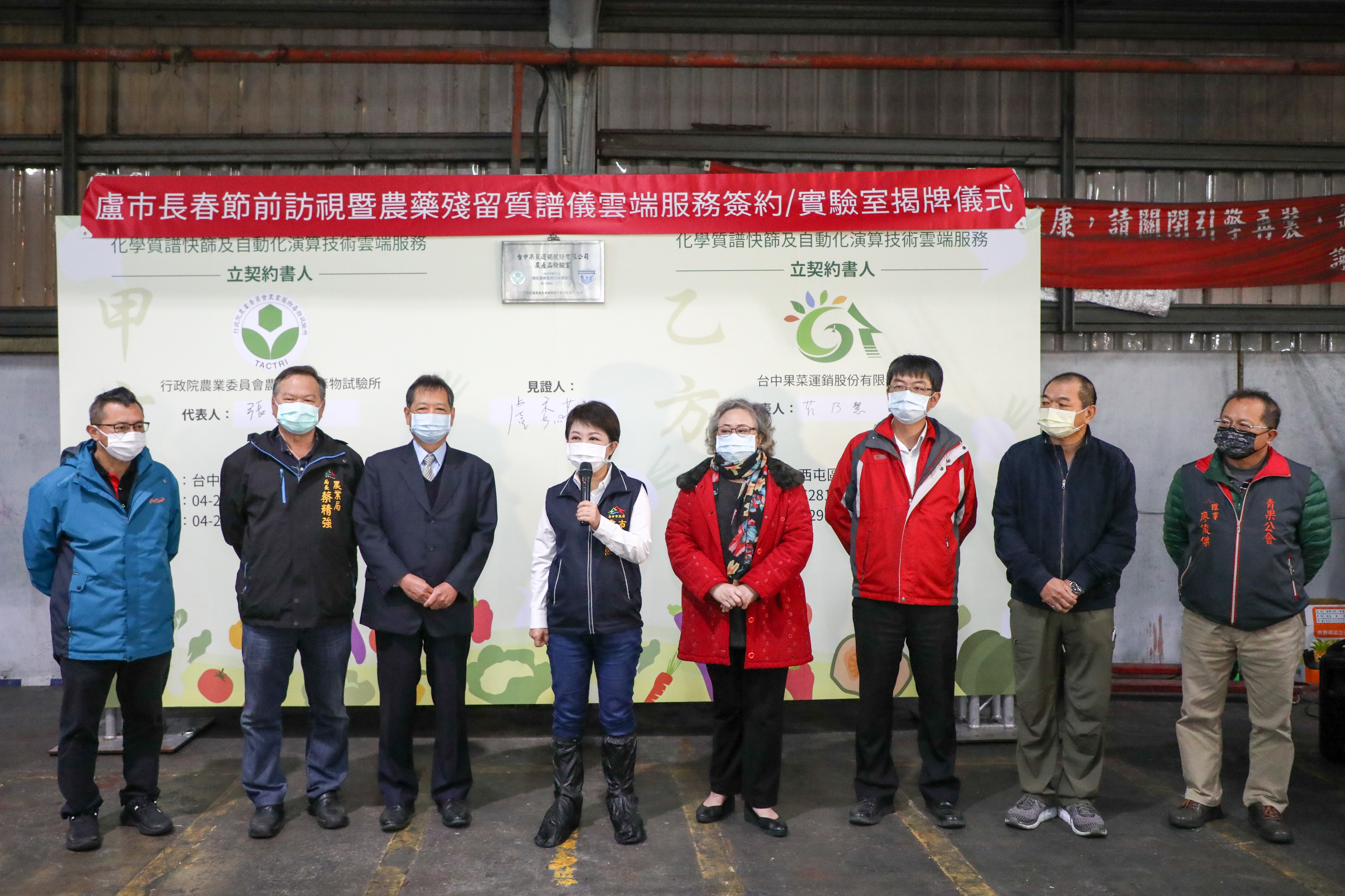 盧市長隨後轉往台中果菜批發市場視察,並為果菜市場質譜快篩儀啟用揭牌,農業局蔡局長、行政院農業委員會農業藥物毒物試驗所長張瑞璋、台中果菜運銷股份有限公司董事長莊乃慧、總經理余家彥、青果工會理事長林振聰皆出席見證。