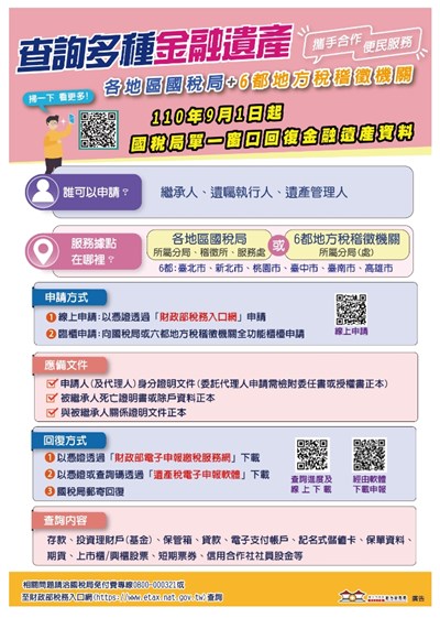 地稅局表示,今年3月15日起民眾可就近至各地區國稅局及6都任一地方稅稽徵機關辦理查調被繼承人金融遺產資料,再由各金融機構將查詢結果分別回復申請人,惟民眾須等候並接收來自各金融機構回復之資料,相當耗時且不便。