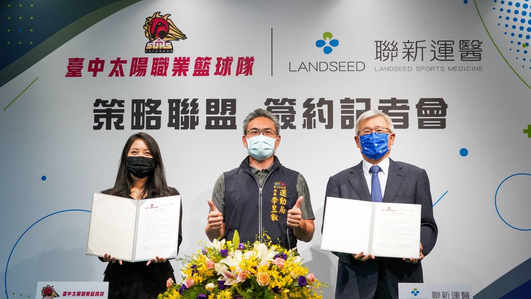 昨日儀式聯新國際醫療集團執行長張煥禎總、聯新運醫公司總經理林頌凱、台中太陽職業籃球隊董事長孫子荃、台中太陽職業籃球隊總經理汪蔚傑等人代表簽署,由李局長擔任見證人,另中華奧會副主席蔡賜爵、台中市發展體育教育基金董事長林廷芳、國立台灣體育運動大學校長許光麃、國立台灣體育運動大學校友總會理事長王景成、T1聯盟賽務長賈凡也到場支持。(10/14*10)*運動局