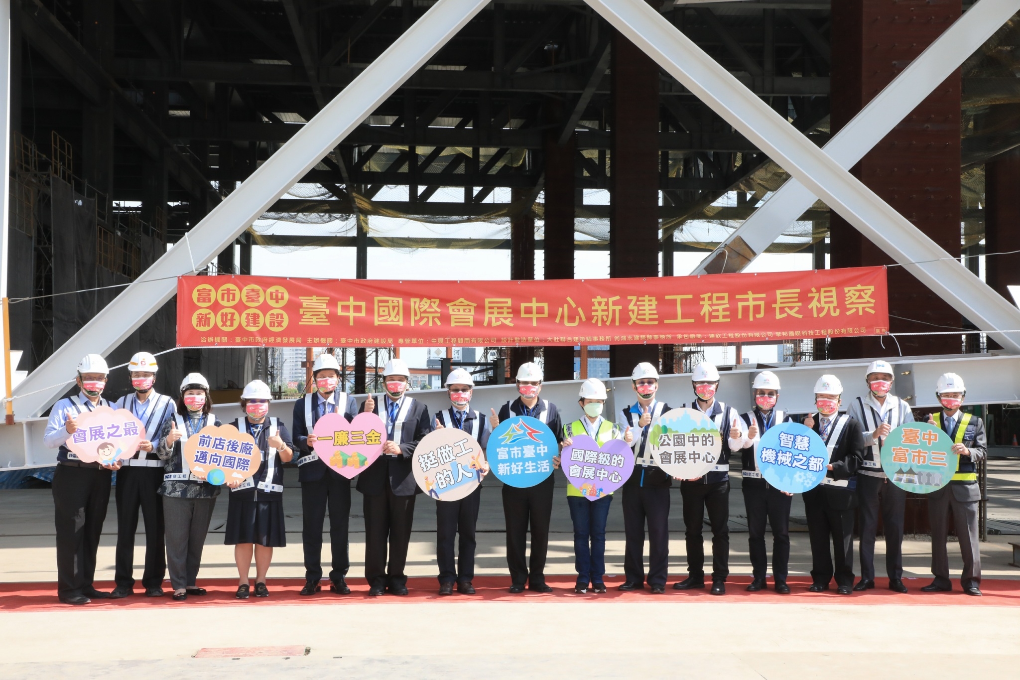 台中市政府持續推動台中重大工程,完善各項指標性場域建設,其中台中國際會展中心108年3月開工,是全台屋頂曲面最複雜、使用最多空間桁架的會展中心,屋頂為簡潔的曲面天際線,猶如一張輕巧的魔毯,目前工程推進中。市長盧秀燕今(1)日前往工區視察展覽棟第一階段屋頂桁架吊裝作業,親手安裝屋頂桁架螺栓,肯定施工品質並慰勞工程團隊辛勞,期盼工程人員平安、興建順利。