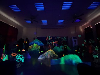 台中市政府文化局今年以「好所在」為主題,舉辦公共藝術美感扎根教育推廣計畫,第二場前進大安區海墘國小,由藝術家王柏霖以大安港口聚集的海翁(鯨魚)為靈感,引導師生延伸創作完成臨時性公共藝術作品「大安海翁悠游」。今(27)日舉辦揭牌儀式暨成果發表會,藝術家王柏霖親自導覽,並邀請童顏劇團演出黑光體驗劇「快樂水晶宮」,帶來充滿大海瑰麗幻想的劇場藝術體驗。