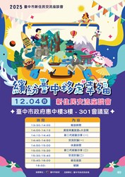 臺中市114年移民節慶祝活動「繽紛臺中 移定幸福」訂於114年12月6日(星期六)上午9時至下午1時於臺中市新住民藝文中心前廣場(...