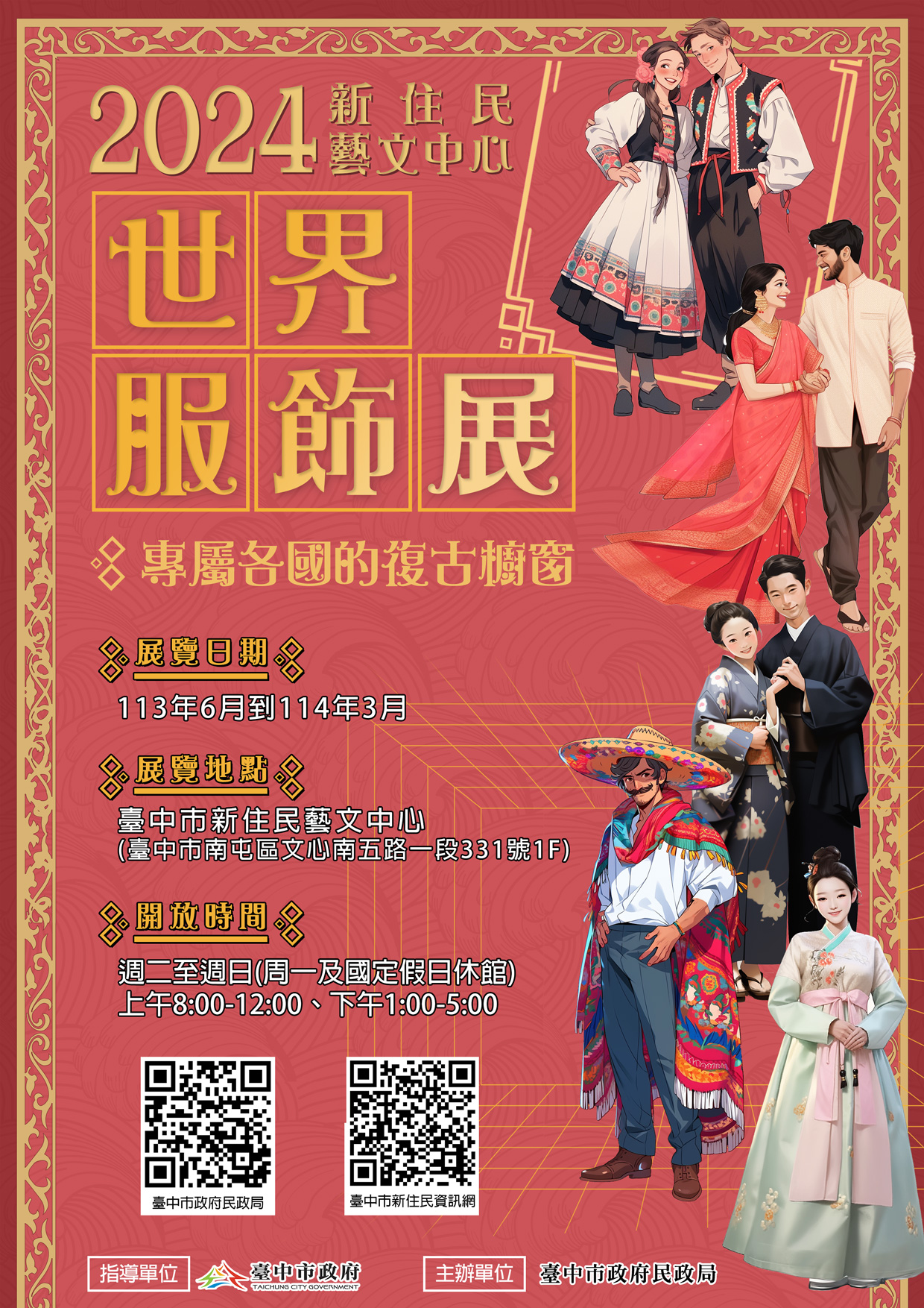 2024新住民藝文中心世界服飾展 展覽名稱:2024新住民藝文中心世界服飾展展覽期間:113年6月至114年3月展覽地點:臺中市新住民藝文中心(臺中市南屯區文心南五路一段331號1樓)開放時間:周二至周日(周一及國定假日休館),上午8:00-12:00、下午1:00-5:00