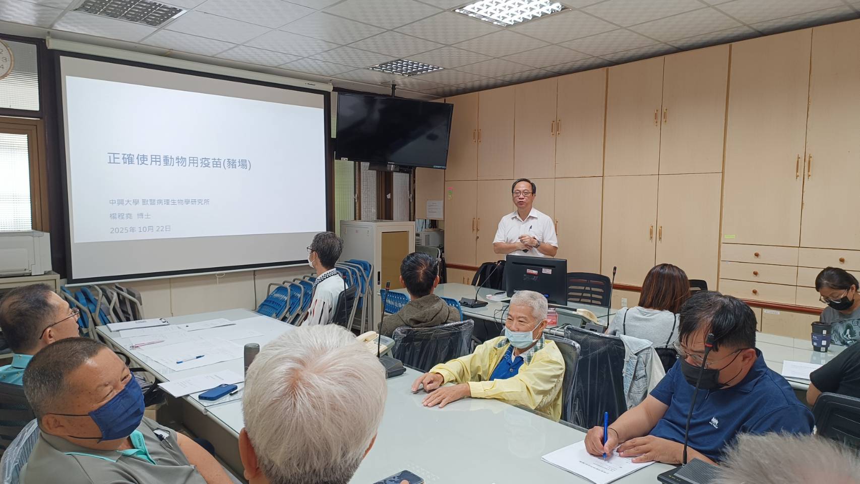 為提升畜禽飼養業者對合法動物用藥選購與正確使用之認識,避免抗藥性產生並防範畜禽產品藥物殘留,臺中市動保處114年10月22日於外埔區公所2樓會議室辦理「114年養畜禽業者正確安全動物用藥宣導」課程,特別邀請國立中興大學獸醫病理學生物研究所楊程堯副教授擔任講師,針對「如何正確使用疫苗—以豬場為例」進行專題演講,內容涵蓋疫苗正確施打觀念、生物安全措施及飼養管理實務,兼具理論與實務,獲得與會業者熱烈迴響。