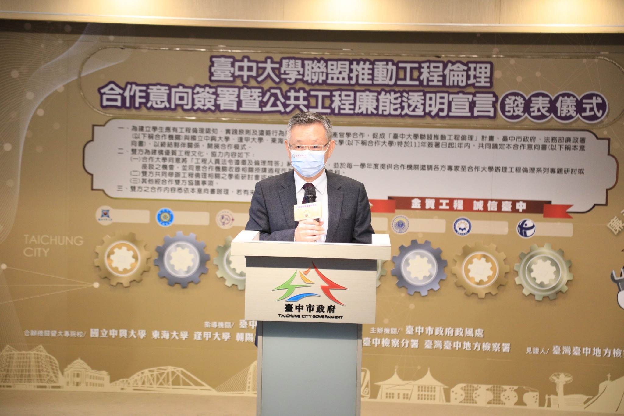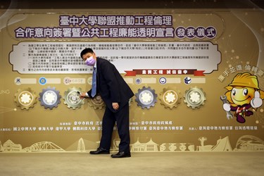 市府政風處今日在台灣大道市政大樓舉辦「台中大學聯盟推動工程倫理」合作意向簽署暨公共工程廉能透明宣言發表儀式,副市長陳子敬、廉政署副署長沈鳳樑及國立中興大學副校長林俊良、逢甲大學校長李秉乾、東海大學校長張國恩、朝陽科技大學校長鄭道明,在台中地檢主任檢察官黃政揚及台灣透明組織顧問團召集人暨僑光科技大學校長余致力的見證下,共同簽署發表合作意向及廉能透明宣言,展現跨域合作堅守廉能風氣的決心。