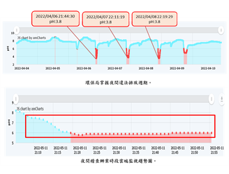 環保局長陳宏益指出,今年4月起,台中市太平區某一高污染潛勢區下游處,水盒子數據常有夜間水質異常,環保局稽查人員進一步分析數據變化趨勢、掌握水質異常好發週期並鎖定可疑污染源,輔以雲端監視蒐證,5月初查獲一電鍍廠夜間排放廢污水。他強調,「水盒子」可即時監測環境,掌握各流域關鍵河段污染情形及異常污染排放週期,有效限縮可疑污染對象,強化稽查量能,只要查獲污染情事且事證確鑿,必將依法開罰,讓不法業者無所遁形。