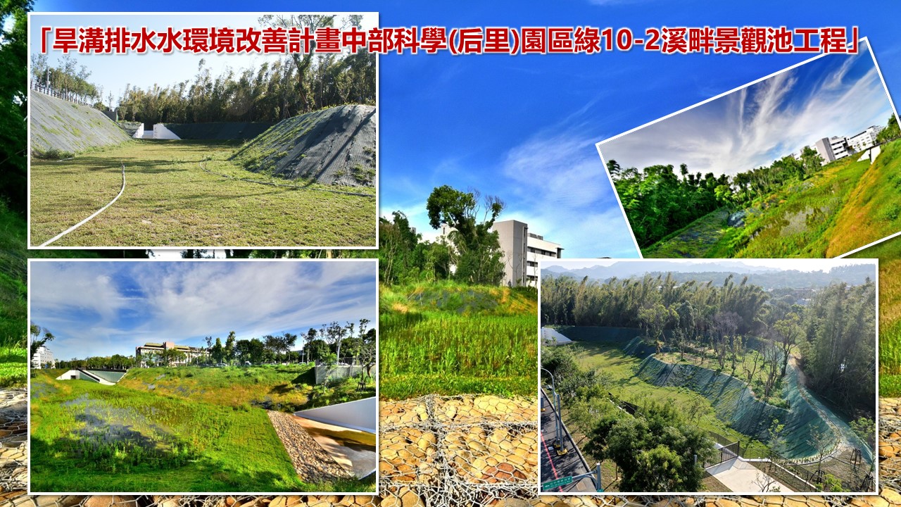水利局說明,榮獲「大賞獎-樂活生態獎」的「旱溝排水水環境改善計畫中部科學(后里)園區綠10-2溪畔景觀池工程」,為提升后里地區防洪安全,同時兼顧休憩及生態機能,打造面積約1.06公頃的生態滯洪池,尤其通過近日梅雨鋒面過境的強降雨考驗,易淹區域已無淹水情形,成功發揮滯洪減災功效;所在地因屬石虎重要棲地,在工程設計初期,便納入生態保育考量,保留既有喬木及植物,營造適合動植物棲息處所,並於臨路側規劃人行步道、賞景等空間,提供園區及周邊居民舒適的休憩空間。