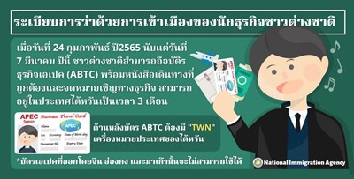 ตามมาตรการเข้าประเทศล่าสุดที่ออกโดยศูนย์บัญชาการแพร่ระบาดกลางเมื่อวันที่ 24 กุมภาพันธ์ ปี2565 นับแต่วันที่ 7 มีนาคม ปีนี้ หากชาวต่างชาติจำเป็นต้องเดินทางมาประเทศไต้หวันเพื่อเจรจาทางธุรกิจ ก็สามารถถือบัติธุรกิจธุรกิจเอเปค Asia-Pacific Travel Card (APEC) Business Travel Card (เรียกสั้นๆ ว่า ABTC) พร้อมหนังสือเดินทางที่ถูกต้องและจดหมายเชิญทางธุรกิจเมื่อผ่านการตรวจสอบและอนุมัติจากกรมตรวจคนเข้าเมืองของกระทรวงการต่างประเทศ สามารถอยู่ในประเทศไต้หวันเป็นเวลา 3 เดือน โปรดทราบว่าช่อง "VALID FOR TRAVEL TO" ที่ด้านหลังบัตร ABTC ต้องมี "TWN" รหัสประเทศของไต้หวัน จึงเป็นไปตามข้อกำหนดนี้เท่านั้น และบัตรเอเปคที่ออกโดยจีน ฮ่องกง และมาเก๊านั้นจะไม่สามารถใช้ได้
