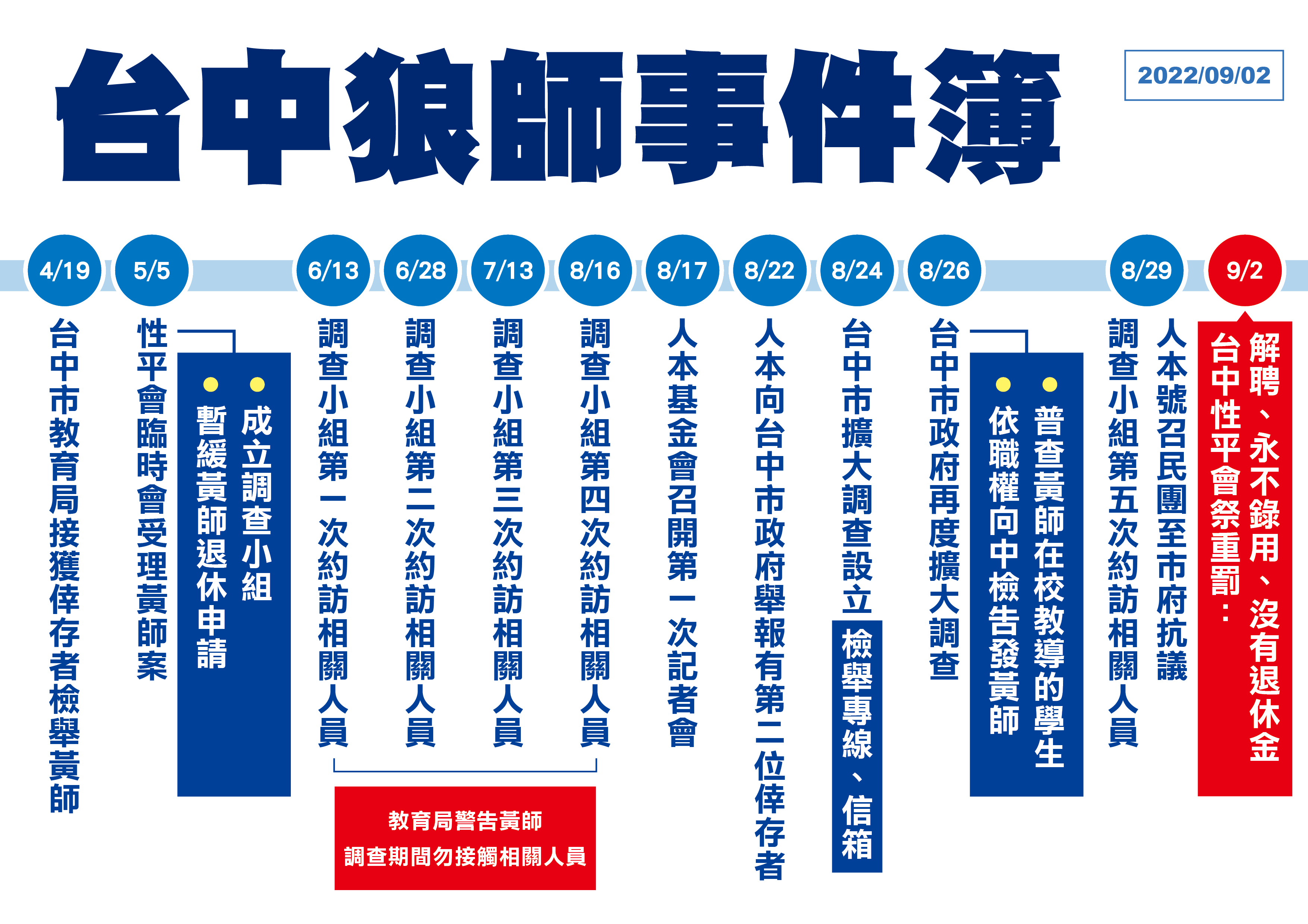 教育局進一步還原時間軸,此案4/19接獲檢舉後,5/5即召開性平會臨時會,並組成調查小組,分別在6/13、6/28、7/13、8/16、8/29調查、訪談當事人、行為人及關係人等工作,近4個月多次調查,性平會今(2)日下午於審議調查報告後,同意調查结果及懲處建議,「黃師予以解聘、永不錄用、沒有退休金」。調查工作持續中,並無消極。