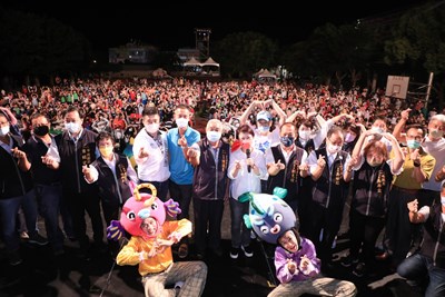 今日現場小朋友嗨翻天,海底世界運動會包含小丑魚、海豚、海龜等魚類選手,在上千名觀眾推移下在空中翻滾,現場加油聲不斷。「國慶連假快樂!」盧市長說,很開心在連假之前,邀請到紙風車劇團與大小朋友同樂,今天她擔任海底世界運動會裁判,第一名為海豚,海龜雖慢但充滿勇氣,應頒發最佳勇氣獎,以此鼓勵現場小朋友面對困難仍需努力不懈。