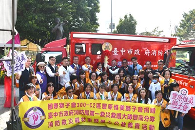 社團法人豐原中央獅子會長陳東昇及豐原惟美獅子會長蕭寶玉賢伉儷,秉持「取之於社會、用之於社會」理念,熱心公益、回饋社會,心懷感念救護車對民眾的幫助,號召募捐1輛小型消防水箱車及1輛救災警備車予豐南消防分隊,增強台中市政府消防局第一線救災量能,強化消防機關救災裝備,提升整體救災效益。