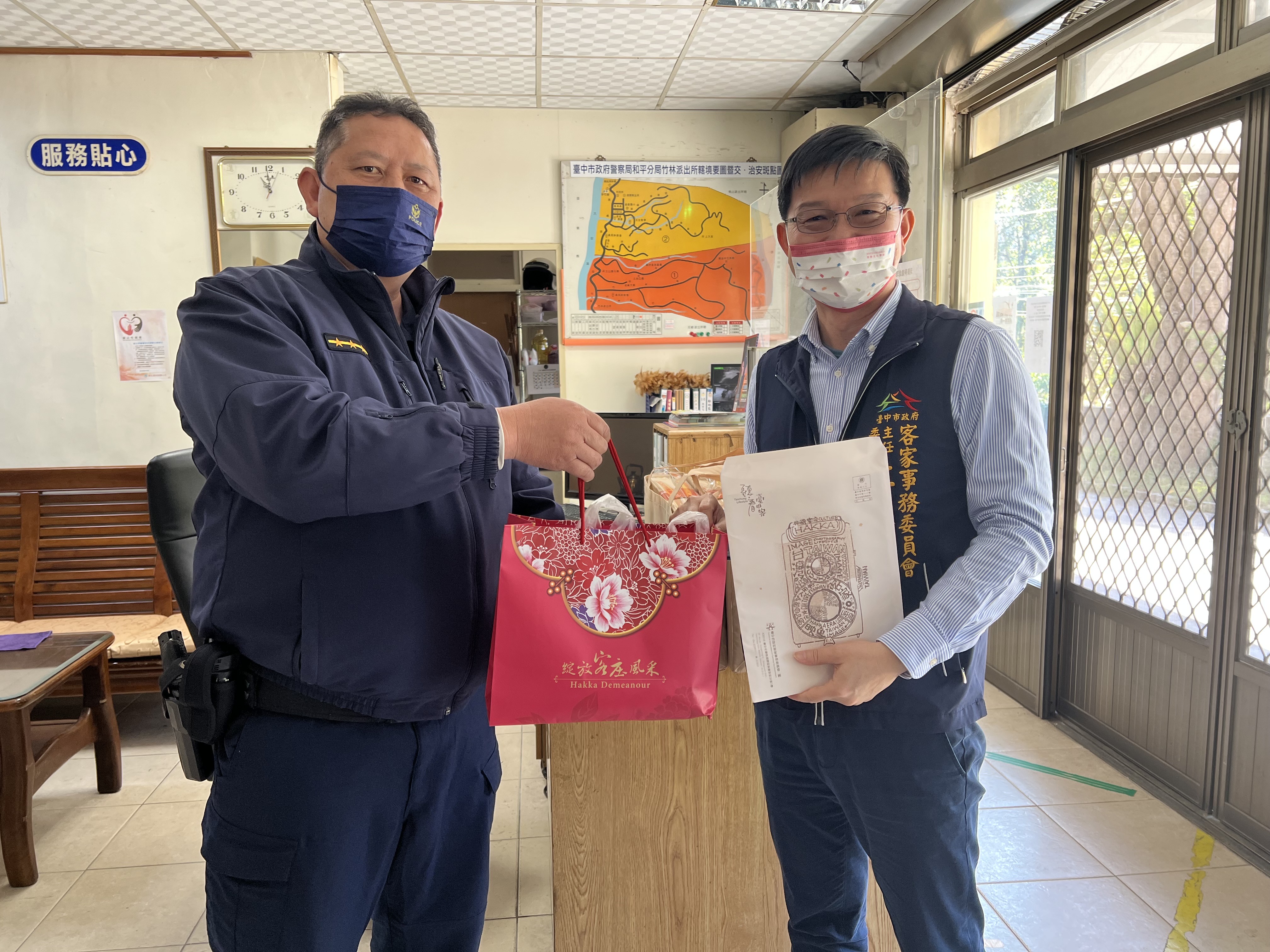 明天就是除夕,家家戶戶除舊布新準備過年,台中市政府客委會主委江俊龍昨(19)日代表市長盧秀燕前往和平區達觀,探視去年8月曾受困家中、生病待援的羅先生、廖女士夫婦,致贈紅包及年菜等生活用品,並前往和平分局竹林派出所贈送年菜及禮物,感謝李姓員警的機警,去年及時協助兩夫婦,同時慰問基層同仁的辛勞。