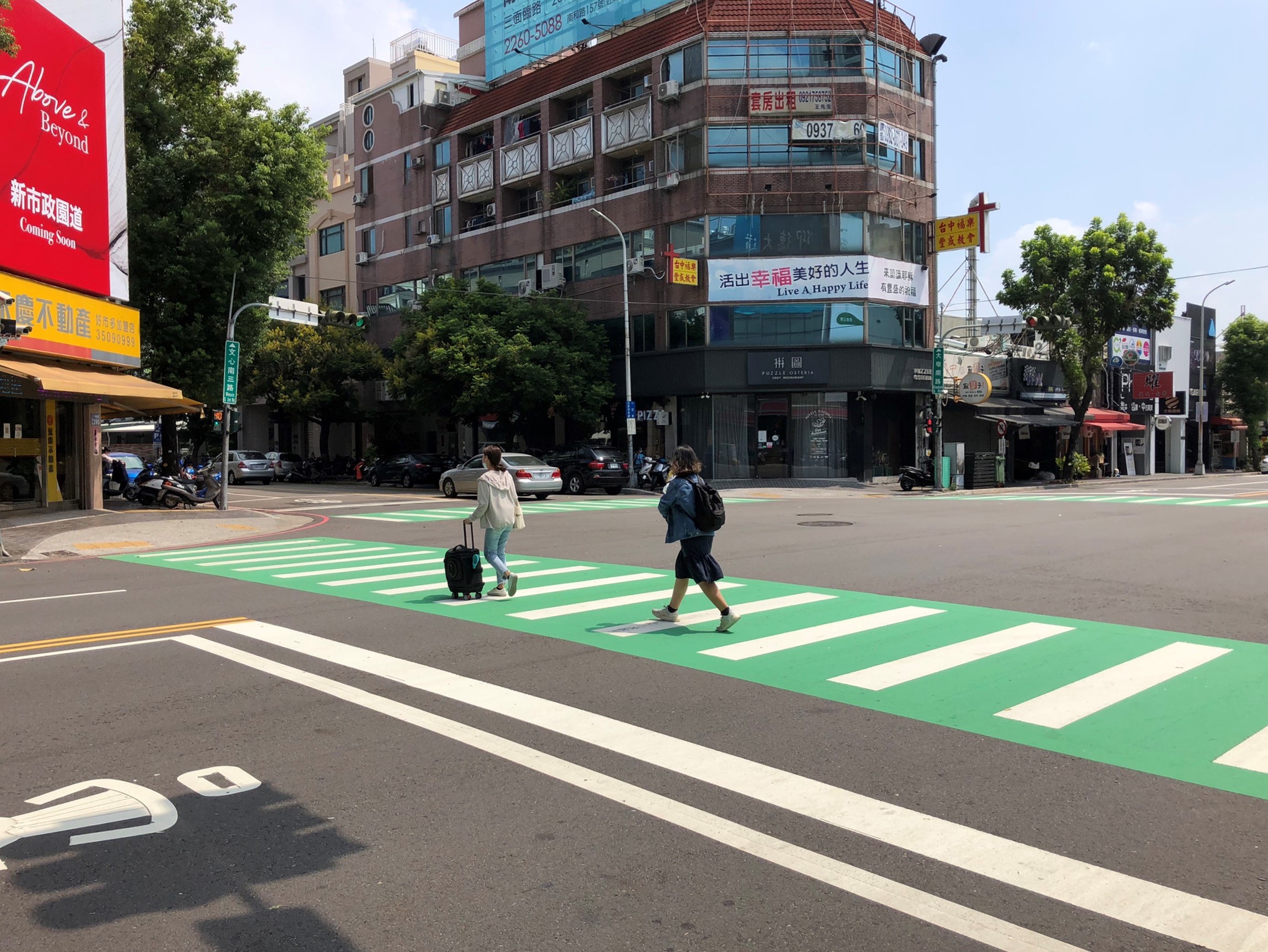 交通局透過「空間管理」及「時間管理」優化行人路口安全,調整行人穿越道及路口交通設施,藉由行穿線退縮、畫設標線型人行道、綠斑馬等交通設施,使行人通行「空間」更加順暢及明顯。此外,大型路口如有中央分隔島,也會適時增設路口行人庇護島,行人若無法於綠燈秒數通過路口,可在庇護島稍作停留,降低行人暴露於路口時間,提升用路人通行安全。