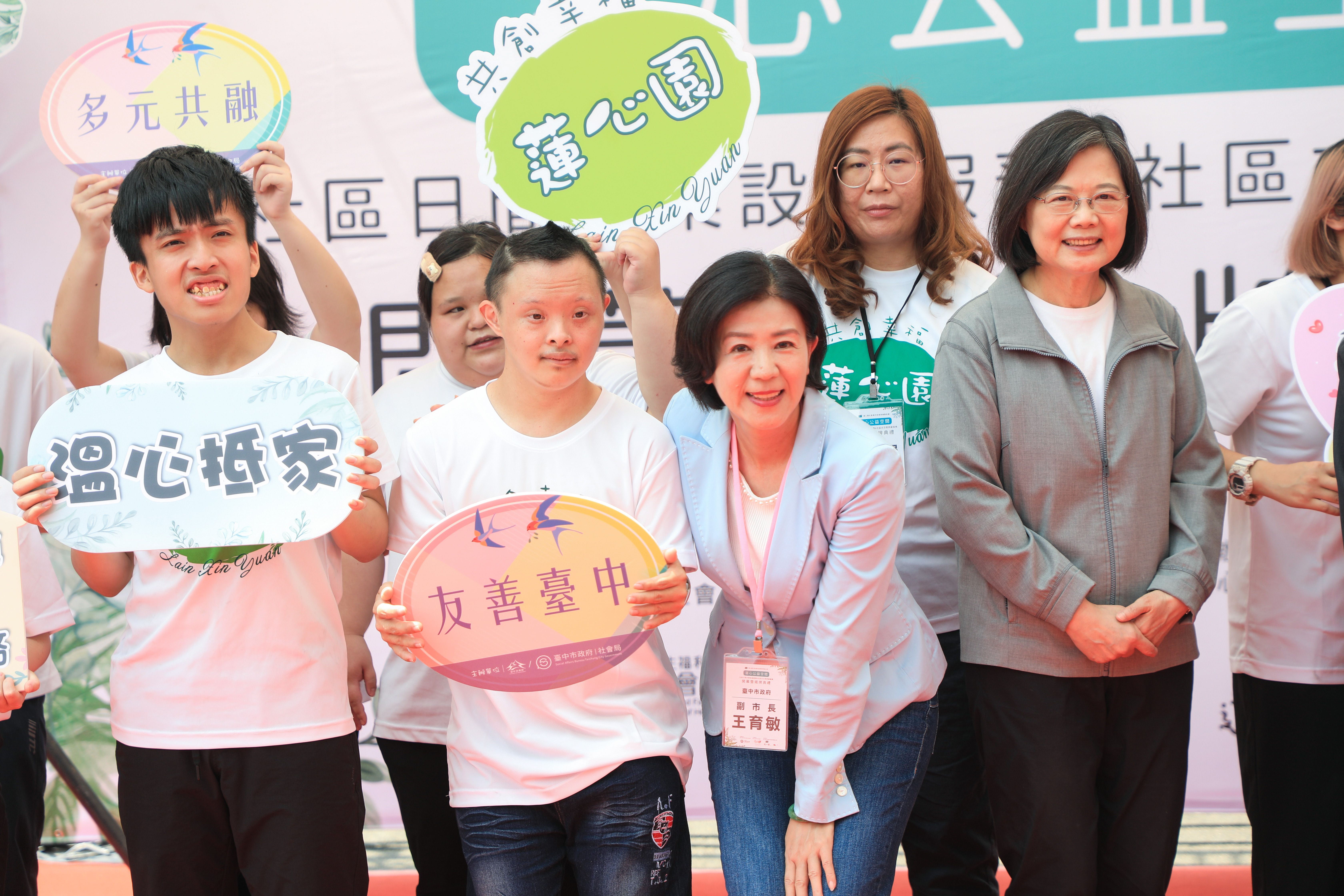 財團法人台南市私立蓮心園社會福利慈善事業基金會與台中市政府社會局合作,成立南區「溫心公益空間」,這是蓮心園基金會在台中市成立的第3處社區式日間服務,今(14)日在據點前舉辦開幕暨揭牌典禮,蔡英文總統、台中市副市長王育敏、蓮心園基金會董事長暨國策顧問張田黨等人皆到場,與身心障礙者一同歡慶據點開幕,並參觀公益商品義賣區,現場氣氛溫馨熱鬧。