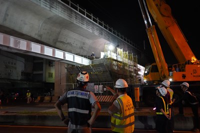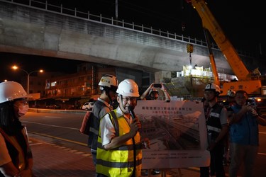 台中市政府持續打造優質「自行車休憩路網」,建設局去年9月下旬啟動「鐵道綠廊台3跨越自行車橋工程」,投入約5,694萬元經費,中央補助3,280萬元,地方自籌2,414萬元,串連圓環東路兩旁綠空廊道,昨(9)日晚上22時開始進行主橋結構吊梁作業,建設局長陳大田也親自到現場視察,並勉勵同仁、施工團隊及義交夥伴的辛勞付出。