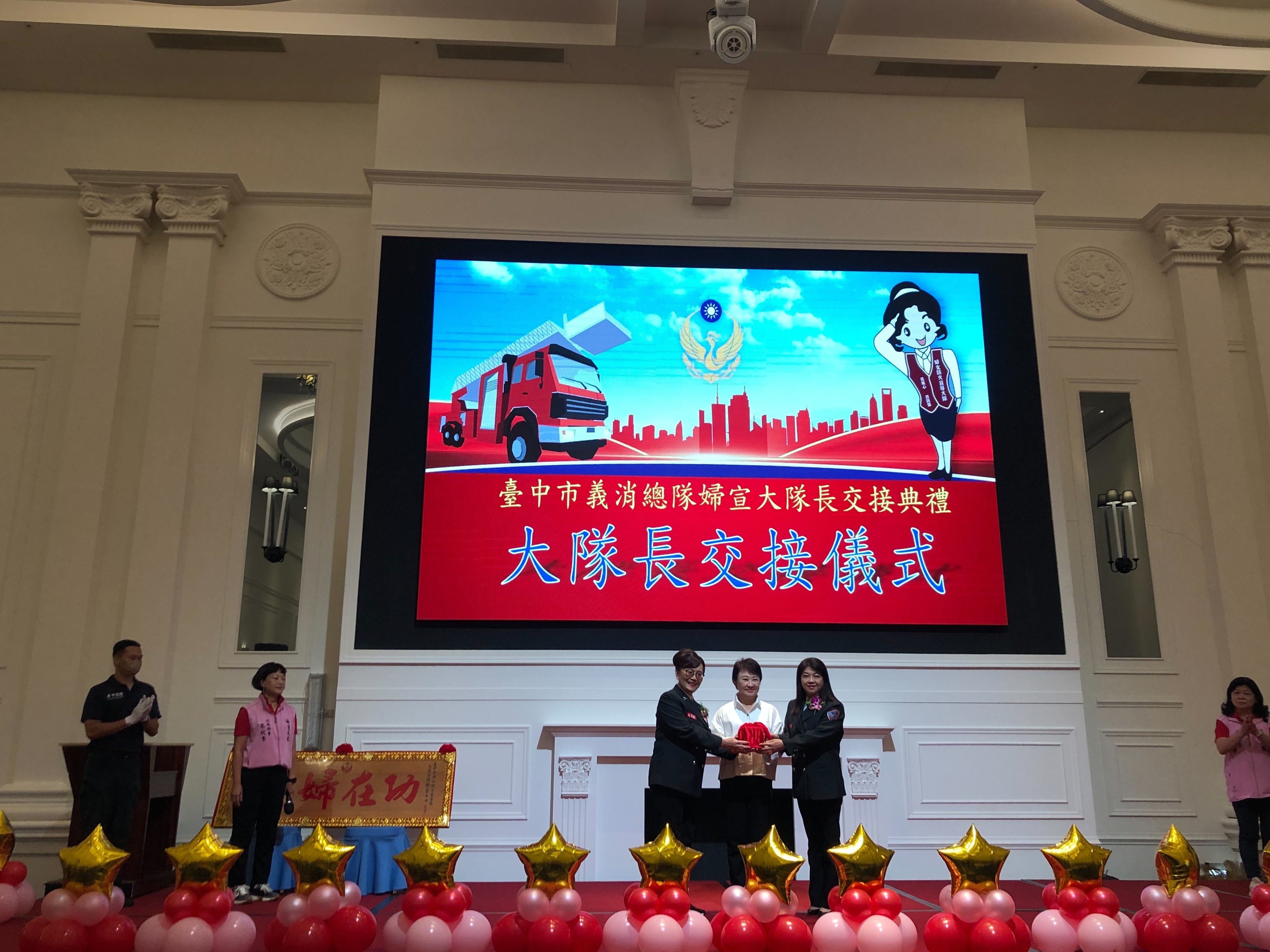 台中市義勇消防總隊婦女防火宣導大隊昨(7)晚舉辦大隊長交接典禮,在市長盧秀燕見證下,前任大隊長張鈴雪交接給新任大隊長吳瓊華,交接儀式順利完成,活動簡單溫馨,同時盧市長也向勞苦功高的婦宣姊妹們表達無比的敬意與謝意,感謝婦宣隊維護台中市民家園的防火安全。