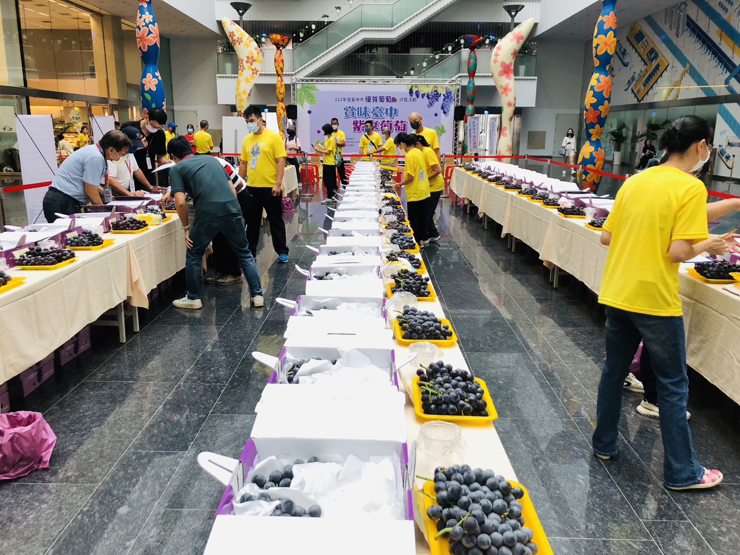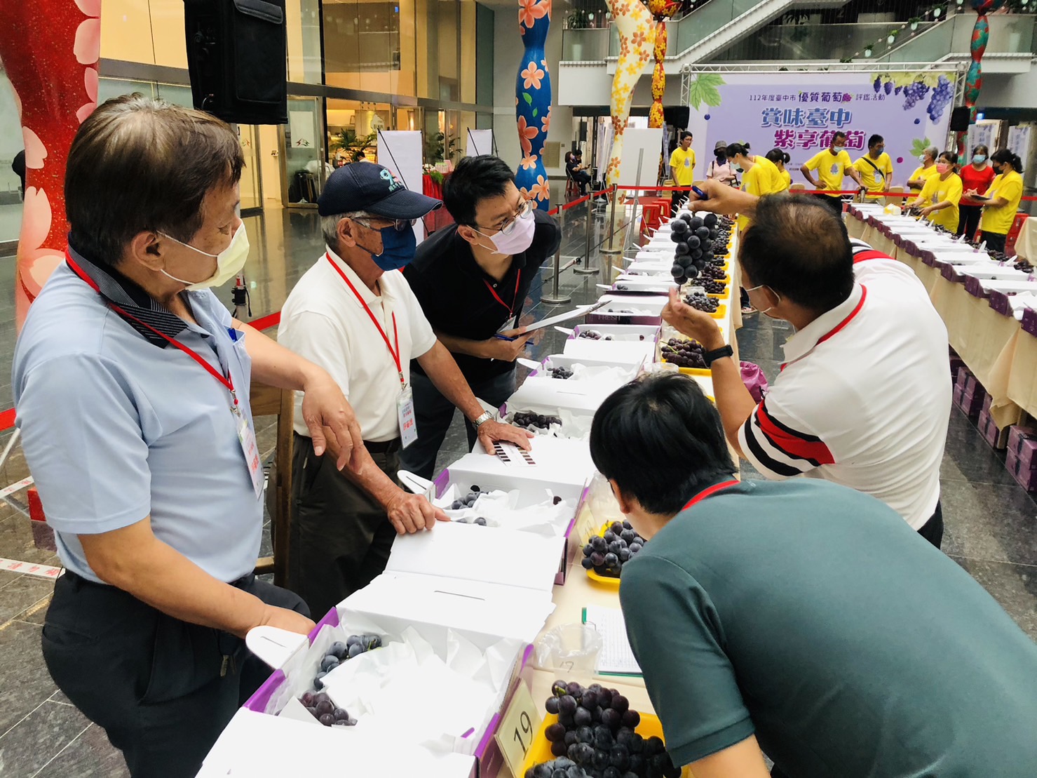 正值巨峰葡萄夏果的盛產期,也是品嘗的最佳時機,台中市政府農業局輔導新社區農會今(25)日在台灣大道市政大樓惠中樓1樓中庭舉辦「112年度台中市優質葡萄評鑑活動」,推廣台中市鮮嫩多汁、香甜可口的巨峰葡萄,此次評鑑計有61組農友報名參賽,就葡萄果品外觀、穗重及粒重、脫粒、著色、糖度、酸度、糖酸比、風味及肉質等項目進行評分,由新社區農友李明浚勇奪第一名,獲得獎牌及獎金2萬元。