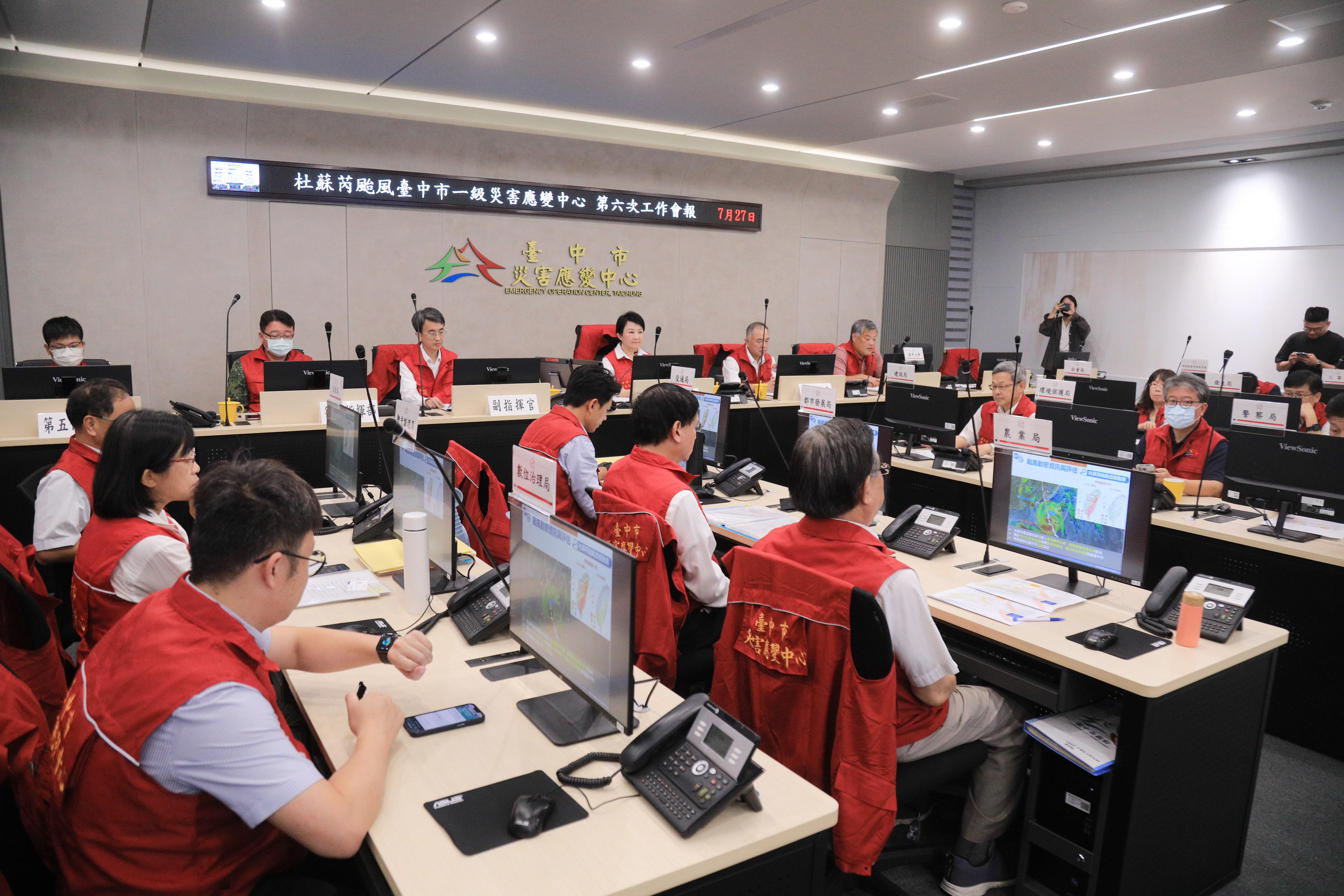 根據氣象局預報資料顯示,台中市預計明(28)早即可脫離暴風圈;台中市長盧秀燕今晚8時召開第六次工作會報表示,市府應變中心提前一級開設做好萬全準備,謹慎因應此次颱風,目前情況已趨於樂觀,若一切順利,明日上午8時將解除颱風警報,但仍提醒同仁留意外圍環流影響,持續機動應變,希望一切順利、平安。