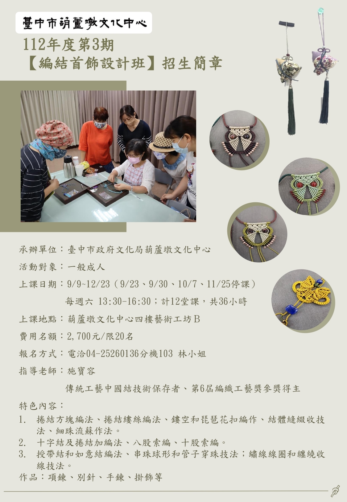 3.授帶結和如意結編法、串珠球形和管子穿珠技法;繡線線圈和纏繞收線技法。