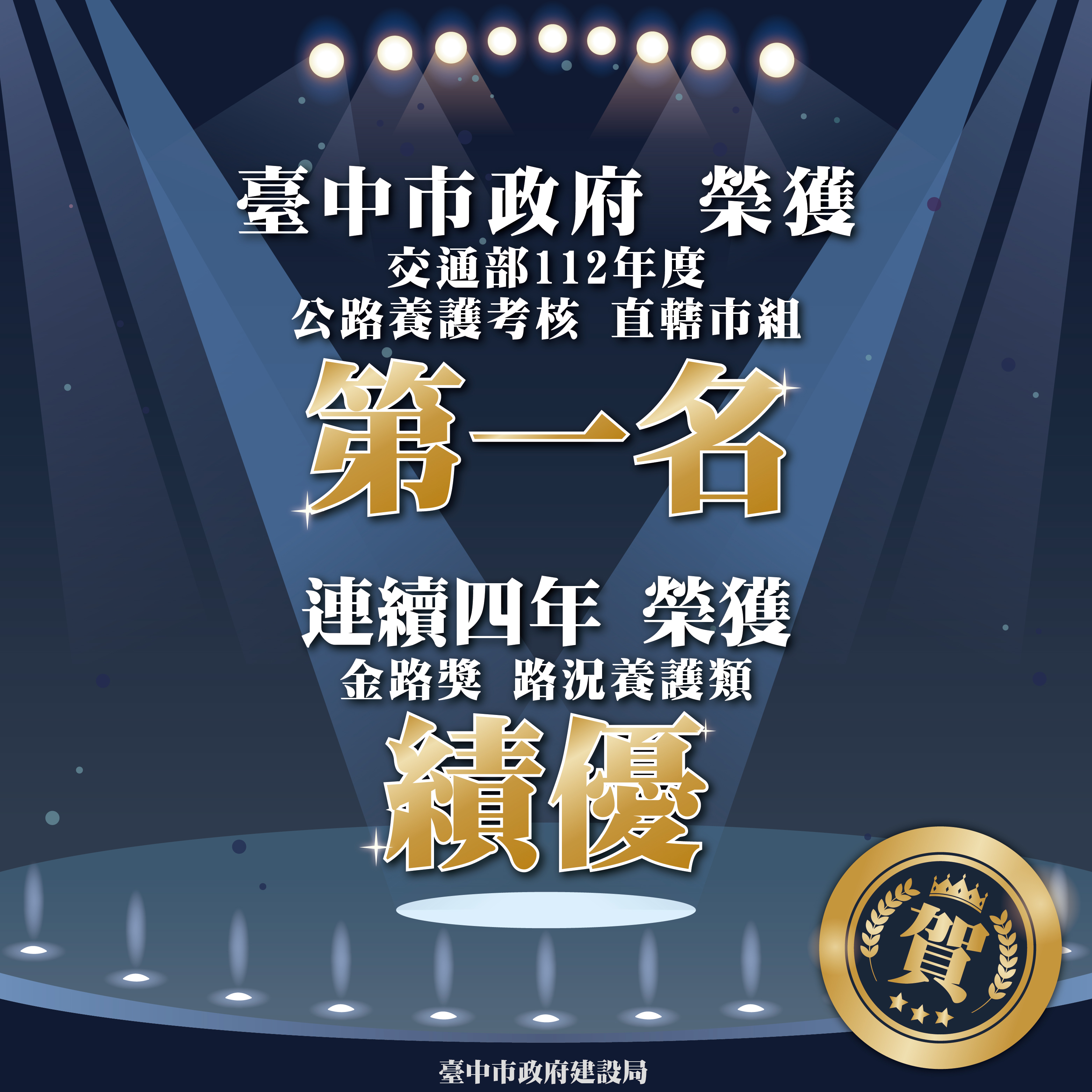台中市政府建設局勇奪交通部今年度辦理「各直轄市、縣政府轄管公路養護考核」直轄市組「第一名」,更連續4年獲「金路獎」路況養護類「績優」肯定,優異成果展現市府提升道路品質及改善人行通行環境的決心。