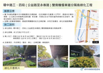 台中市長盧秀燕重視城市環境綠美化,市府建設局110年開始與台積電合作改善台74橋下綠化,營造台中環線綠廊景緻,兩年來已成功完成西屯區(朝馬路至公益路) 兩側快慢車道分隔島綠化,今年度將持續推動第三期計畫,改善公益路至永春路兩側快慢車道分隔島綠化,預計明年6月底前完成綠美化作業,實踐盧市長「富市台中,新好建設」願景。