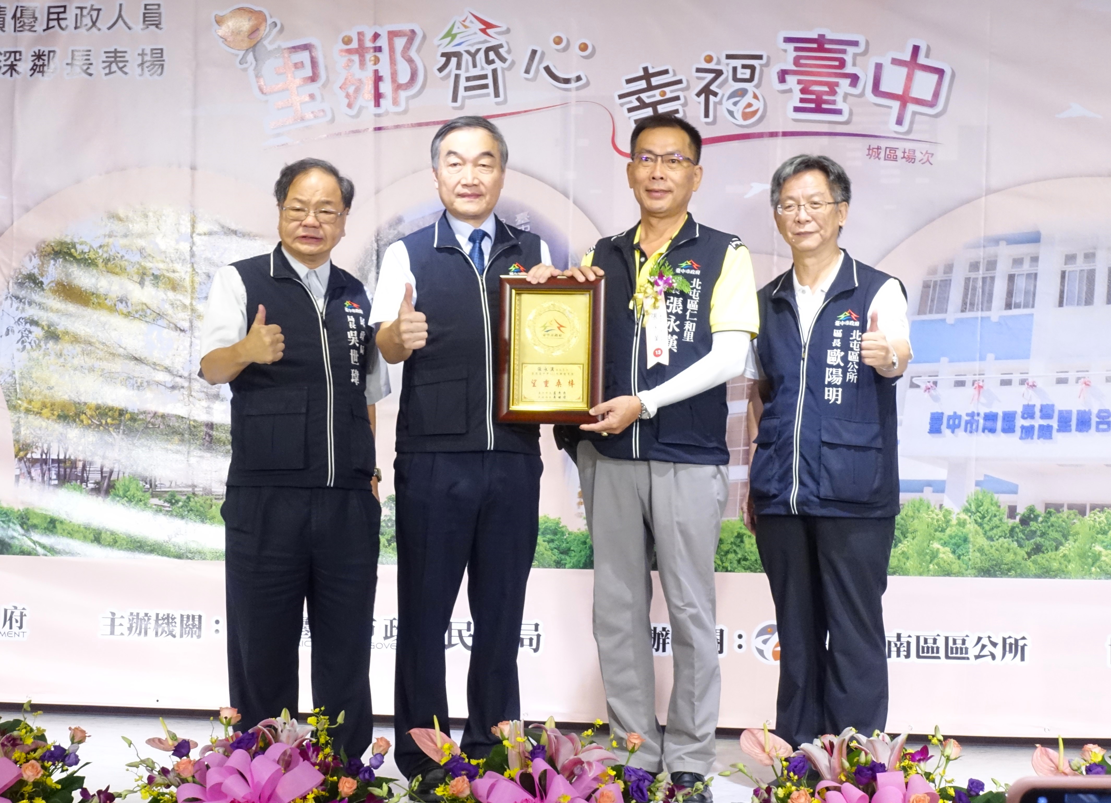 民政局說明,台中市今年度舉辦4場(屯區、山線、海線、城區)里、鄰長及民政人員表揚活動,表揚全市55名特優里長、23名績優民政人員、911名績優鄰長及322名服務年資超過20年的資深鄰長,共1,311人獲獎;感謝里鄰長及民政人員長期的辛勞付出及奉獻,期盼持續與市府齊心協力守護市民福祉,將台中市各項建設、福利、教育、文化等面向做到最好,打造台中成為幸福宜居的國際大城市。