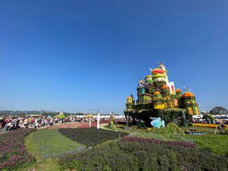 陳局長提到,此屆展區也與新社百大青農,台中最厲害的文心蘭達人詹侑宏合作,詹侑宏透過智慧科技的導入,種植出來的文心蘭每年均外銷超過40萬株,花毯展區內的主要動線上,亦種植超過200米的文心蘭,讓遊客步行進入會場即可觀賞到台中引以為傲的花卉。