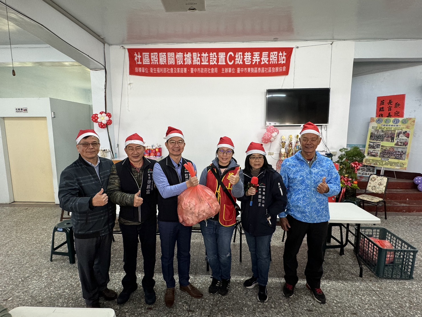 昨日活動,市府客委會主委江俊龍、副主委魏瑞伸、東勢區公所區長翁培真、東勢區泰昌社區發展協會理事長徐燕宗、泰昌里里長徐鎮富、華山基金會東勢愛心天使站站長鄭郁潔、台中市私立同舍社區長照機構主任謝素貞皆共襄盛舉。(12/26*16)*客委會