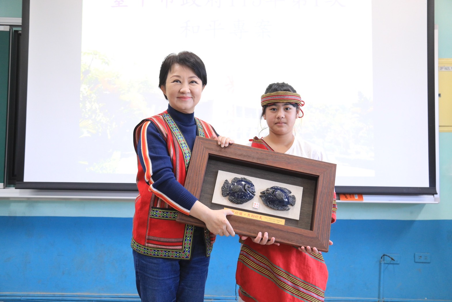 盧市長率市府相關局處會代表前往和平,和平國小學童則贈送盧市長親手製作的陶魚、象徵泰雅族紅白黑的串珠,立委江啟臣、市議員古秀英均到場,市議員朱元宏也派代表關心。