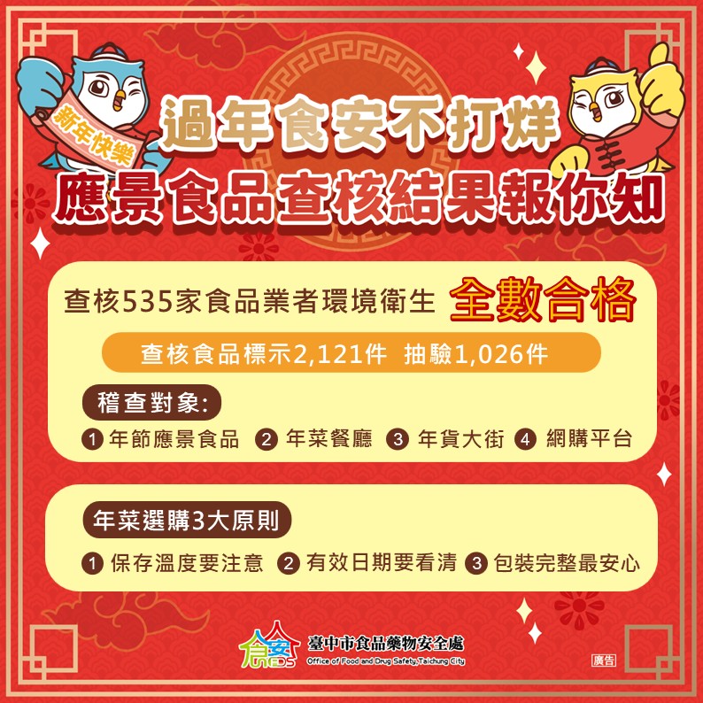 過年食安不打烊 應景食品查核結果報你知 【馬年到、福氣到!臺中春節食安「全數合格」】 春節採買高峰來了,大家是不是已經開始採購年菜、買零食了呢?為了讓大家安心圍爐,衛生局化身「食安守護者」,年前大稽查成果報你知! 這次我們不只跑遍各大賣場、年菜餐廳,連最夯的網購平台和揪團購店面都幫大家巡過了! 這次的安心成績單: 535 家業者查核 2,121 件食品標示 1,026 件產品抽驗 結果揭曉:全數合格!違規率 0%! 所有稽查結果皆公布於「臺中食藥安智慧雲-食安GIS專區」供民眾查詢。 安心過年小指南: 保存溫度要確實: 冷藏食品 < 7°C、冷凍全程 < -18°C,確保不解凍! 有效日期要看清: 選購前留意有效日期,拒絕標示不清或逾期食品。 包裝完整無破損: 避開膨包、滲漏或受潮產品,包裝完整最安心。 有任何食安問題,請撥打 1999。 食安守護不打烊,我們會一路守護到元宵佳節!更多資訊請點我 #臺中市食品藥物安全處關心您#食安不打烊