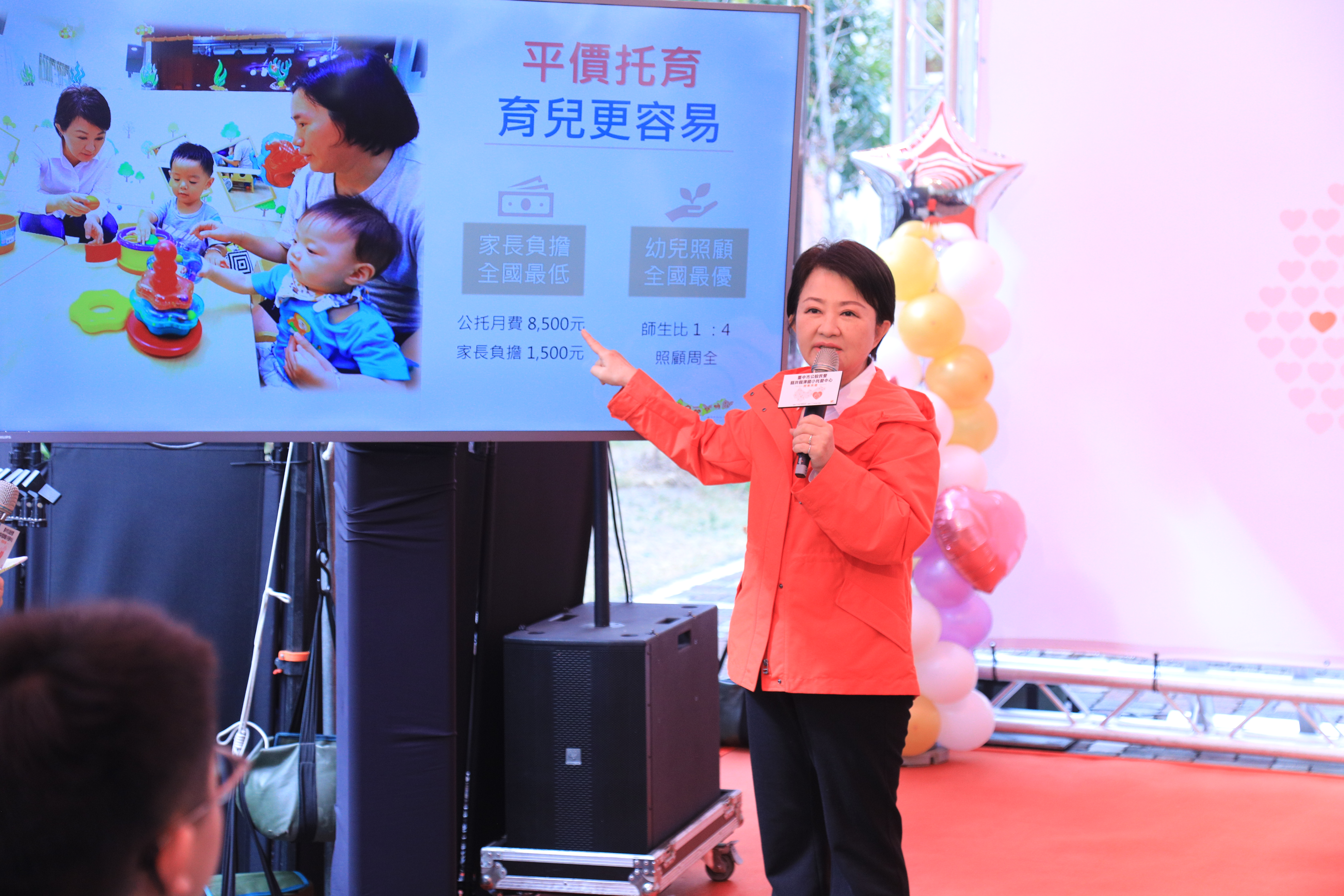 「公托收費六都最便宜、人力配比全國最優!」盧市長強調,她上任5年來,市府力推平價托育政策,家長送托公托每月只要負擔1,500元,享有1位托育人員照顧4名幼兒的專業優質服務,生育津貼更由1萬元加碼到2萬元,致力減輕育兒家庭負擔。