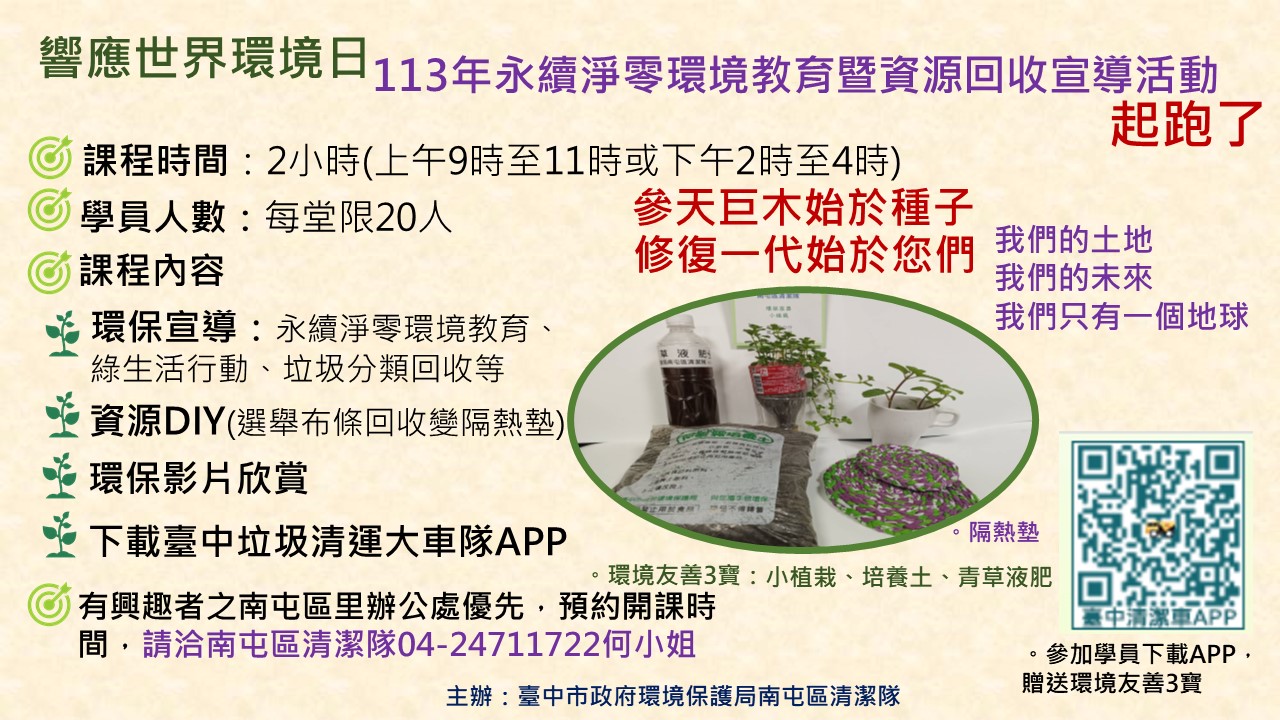 響應今年6月5日世界環境日主題「恢復土地生機、終結沙漠化、守護水安全」、守護地球環保行動,台中市政府環保局南屯區清潔隊推出環境友善3寶:小綠植栽、青草液肥及培養土,今(5)日與三和里辦公處於在三旺福德廟舉辦「永續淨零環境教育暨資源回收宣導活動」。除推廣永續淨零環境教育理念、廢物資源再利用DIY(選舉布條變隔熱墊)的綠色環保行動,該局也分享環境友善3寶環保成果,灑下綠色種子,後續將邀請更多里辦公處一起參與推廣。