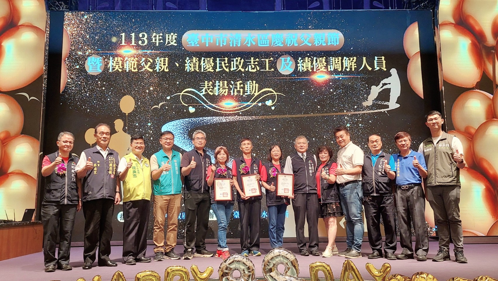 父親節即將到來,為感謝清水區模範父親為家庭奉獻與付出,清水區公所特別規劃今(27)日舉辦「113年度台中市清水區慶祝父親節暨模範父親、績優民政志工及績優調解人員表揚活動」,共有35位模範父親、3位績優民政志工及14位績優調解人員接受表揚。市府運動局長李昱叡與區長蔡慶生代表市長盧秀燕向每位模範父親獻上真誠的祝福,現場溫馨熱鬧。